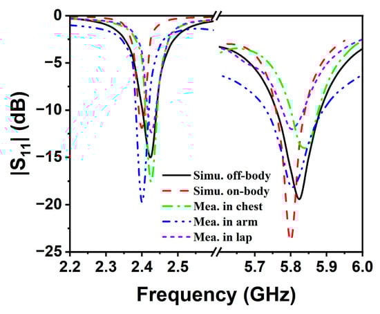 According to Figure 14a,b, the SAR limits at 2.45 GHz for 1 g and 10 g of human tissue are 0.031 W/kg and 0.02 W/kg, respectively. Furthermore, the SAR limits at 5.8 GHz are 0.019 W/kg and 0.01 W/kg for 1 g and 10 g of human tissue, respectively, as shown in Figure 15a,b. It can be seen that the maximum SAR values at both operating frequency points are much lower than the maximum values specified in the IEEE standard. In addition, Figure 16a–c show the antenna’s reflection coefficient frequency responses when attached to different human positions, i.e., chest, arm, and lap. Owing to its microstrip patch configuration, the mutual coupling with human body is quite minor: the simulated and measured |S11| curves are slightly affected. The resonances still fall within the desired 2.45/5.85 GHz ISM band, as shown in Figure 17. Hence, the electromagnetic radiation generated by the proposed antenna sensor is safe for the human body and suitable for wearable applications.