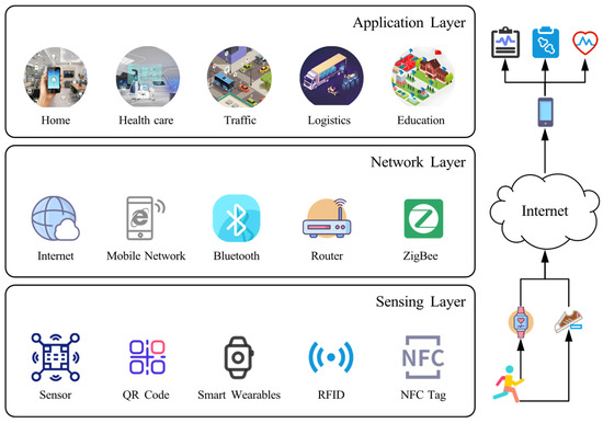 In the general architecture shown in Figure 1, the perception layer at the bottom collects environmental data from sensors, QR codes, smart wearables, and other devices [19]. The network layer in the middle relies on communication technologies such as Wi-Fi, Bluetooth, and Zigbee to transmit data reliably. The application layer at the top provides user-facing services and applications, including smart home [20], smart healthcare [21], smart transportation [22], smart logistics [23], and smart campus [24]. Through this layered design, SIoT supports the end-to-end process from data collection to transmission and service delivery across multiple domains. For example, in a sports health monitoring scenario, the perception layer comprises smart bracelets and smart insoles that continuously measure runners’ heart rate, gait, and other physiological and activity data. The network layer forwards this data to cloud servers via smartphones and the Internet, while the application layer offers advanced health monitoring and social interaction functions through cloud-based applications.