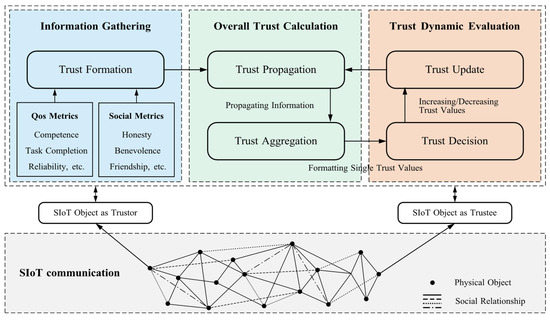 Trust management is the process of establishing and maintaining trustworthy relationships between entities, which can be conceptualized in two forms: the process of making one entity trustworthy to other entities, and the process of assessing the trustworthiness of other entities from the perspective of a particular entity [34]. In SIoT environments, it serves as an intermediate layer between service requesters and providers, enabling trusted interactions for various security services [35]. With the rapid development of SIoT, it has become a critical research issue [36]. As illustrated in Figure 3, a typical trust-management process consists of five main steps: trust composition, trust propagation, trust aggregation, trust decision-making, and trust update.