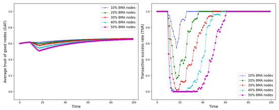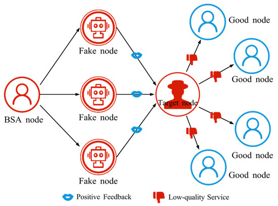 BMA refers to an attacker’s efforts to reduce the trust of a target node by posting a large number of false negative evaluations to it [59], as shown in Figure 4. These evaluations may falsely accuse the node’s equipment, service quality, or interaction behavior, making the node seem untrustworthy to others. Consequently, the target node’s reputation is damaged, affecting its normal operation and potentially excluding it from resource sharing and collaboration.
