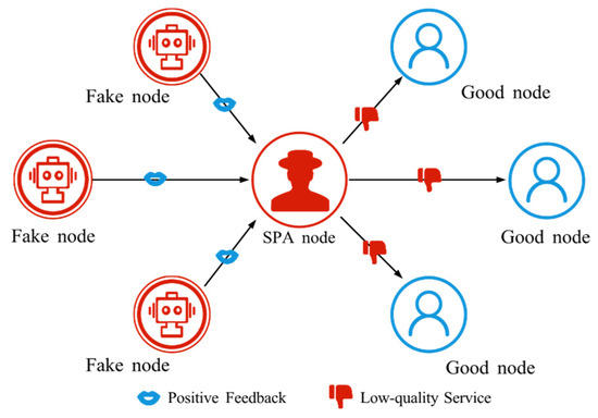 The schematic diagram of SPA. SPA nodes manipulate fake nodes to provide positive feedback, thereby enhancing their own trust.