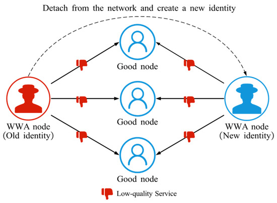WWA refers to the behavior of an attacker who, after being detected, leaves the network and re-enters with a new identity to escape the penalties associated with its previous behavior [61], as illustrated in Figure 8. By repeatedly resetting its identity, the attacker effectively bypasses the trust management mechanism and can continue to damage other nodes and disrupt normal network operation.