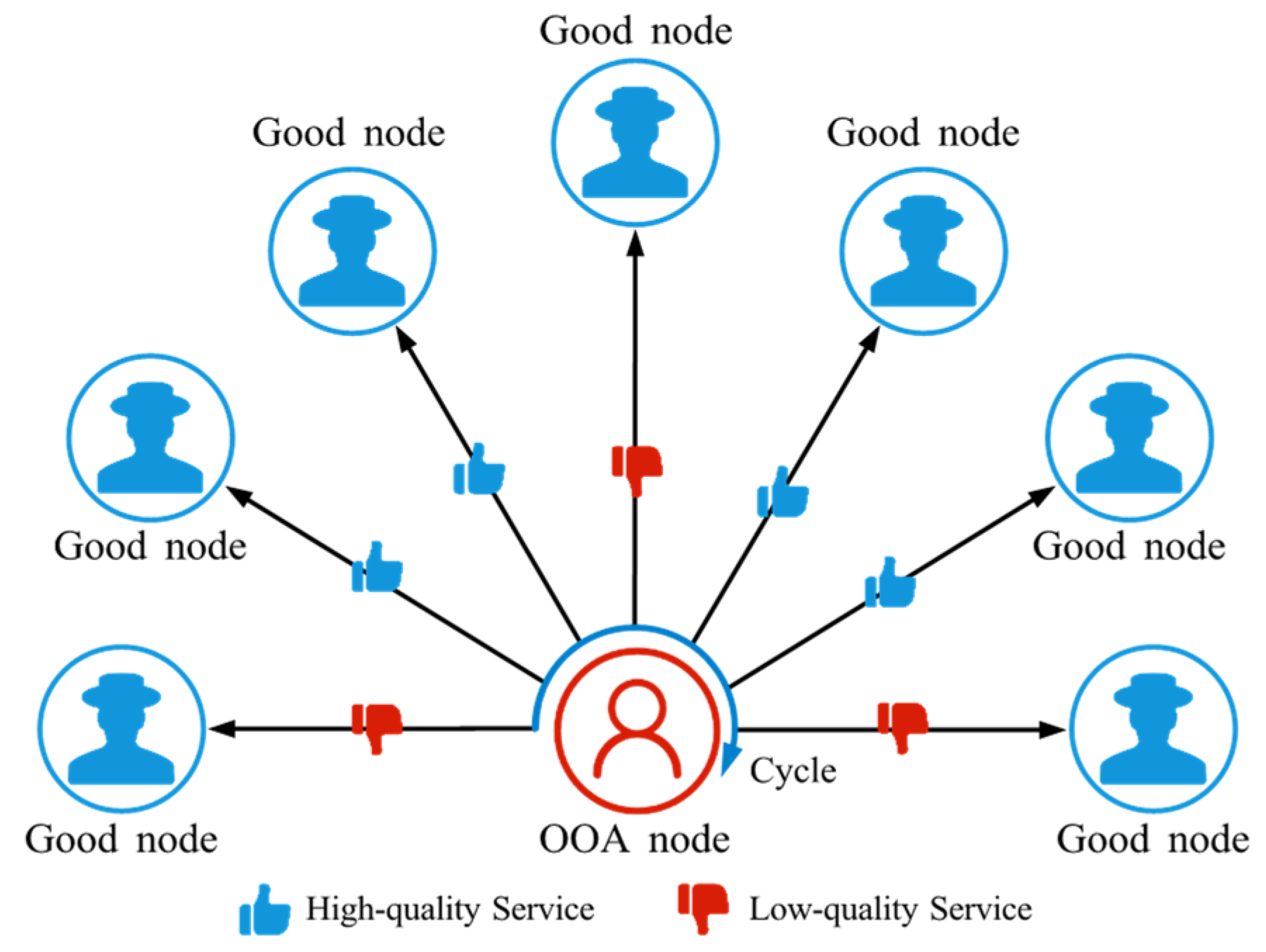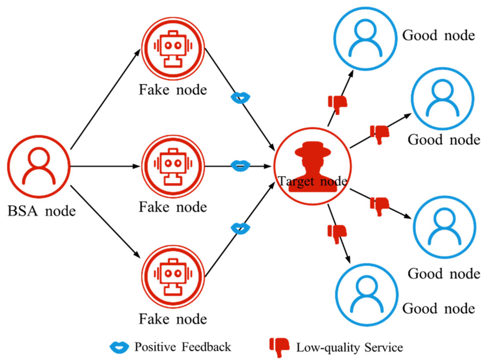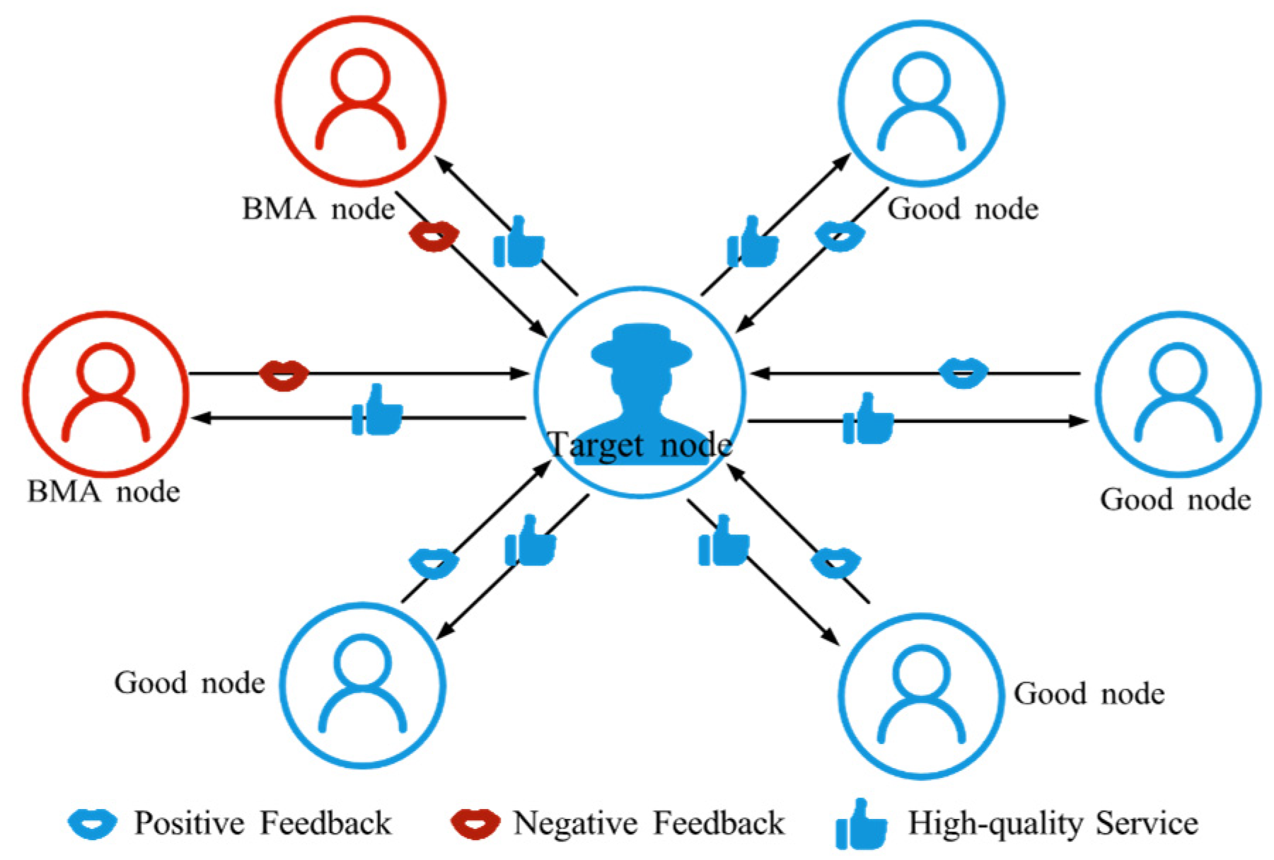 | [94] | BMA: limit repeated attacks; BSA: multi-node evaluation prevents manipulation; OOA: evaluate feedback credibility |