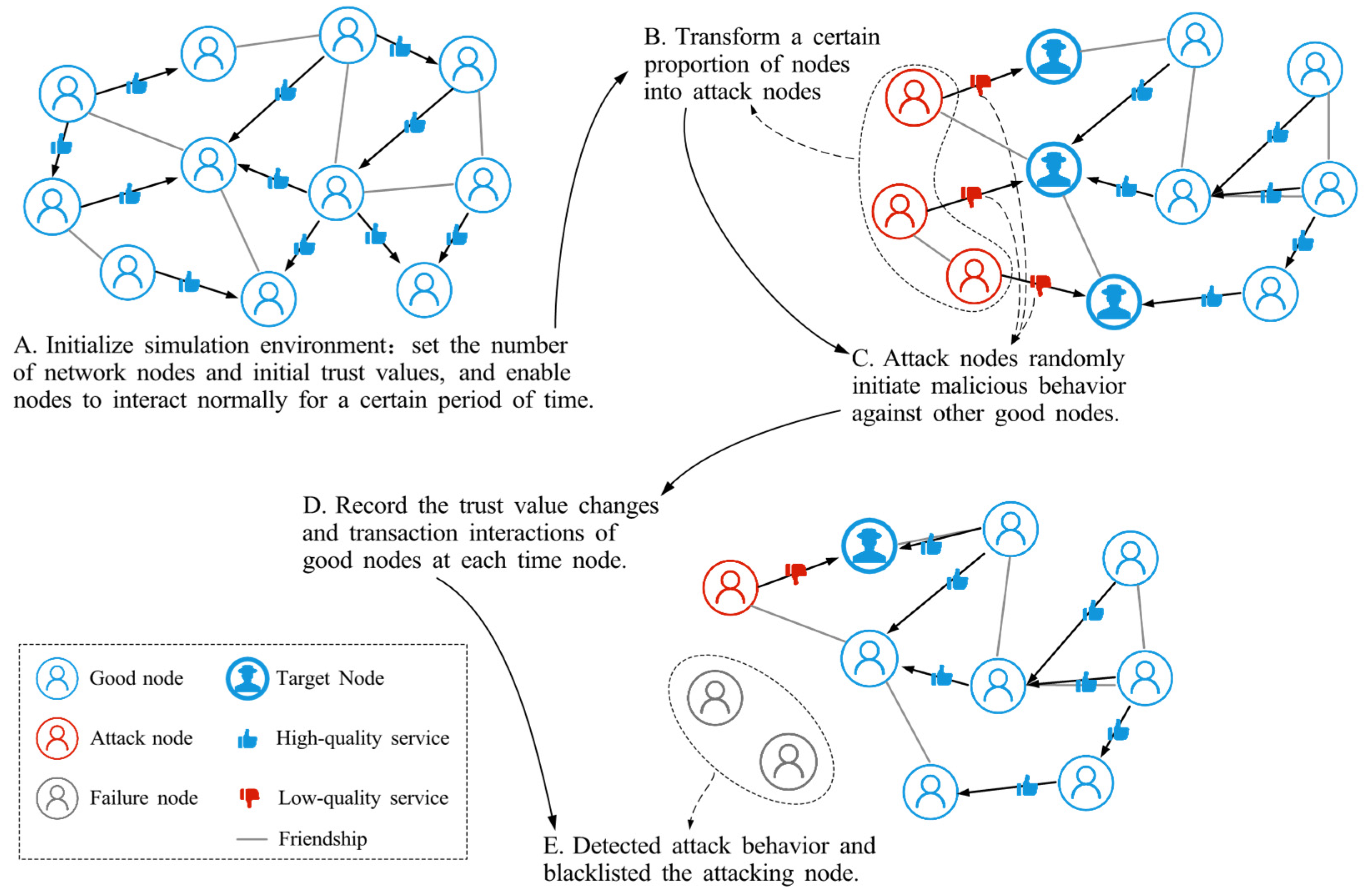 - Implementing trust attacks: as shown in steps B and C, a certain percentage of nodes in the interaction process will be turned into attack nodes, and each attack node will launch an attack behavior with probability at each time step thereafter.
