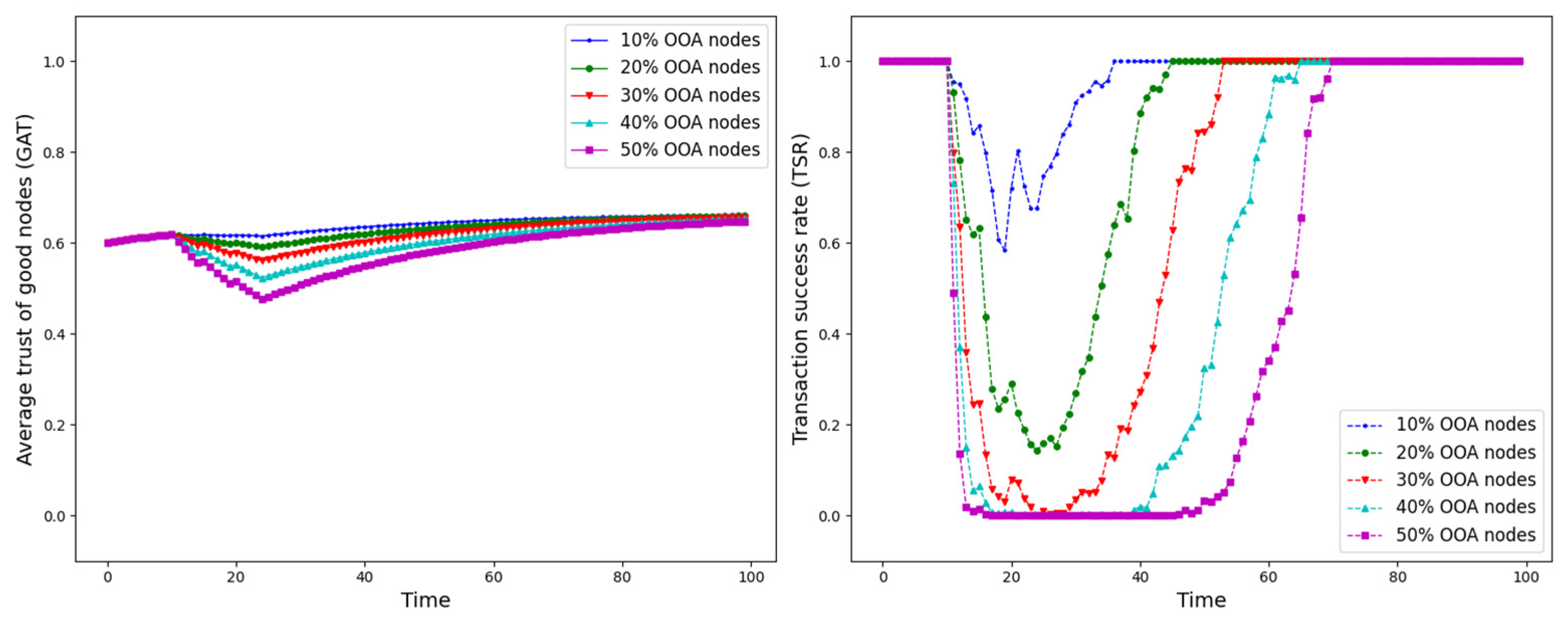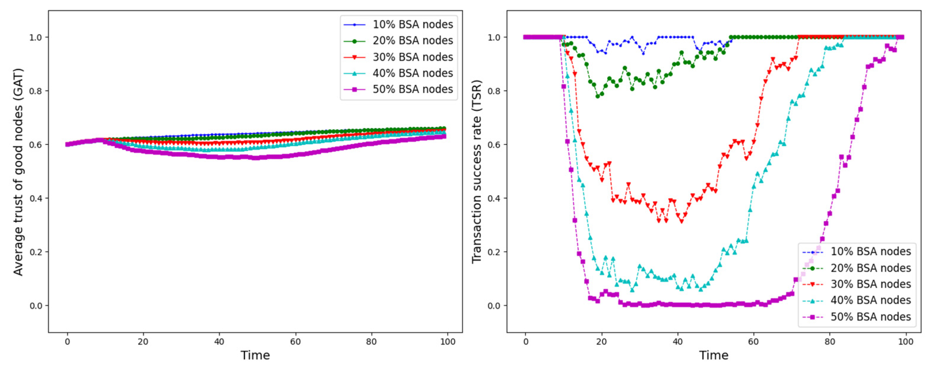 - Attack strength. Using the maximum reduction of GAT and TSR as the criterion, the attack strength ranks as follows: BMA, SPA, OOA and WWA are the strongest; followed by DA; then OSA; and finally BSA. In BMA and SPA, TSR can be driven to very low levels in medium- and high-ratio scenarios, indicating a strong and abrupt destructive effect. OOA and WWA produce minima of similar depth but with longer persistence, so their overall impact is comparable to BMA and SPA. In contrast, DA typically yields slightly higher minima, suggesting a somewhat weaker destructive strength. OSA still causes substantial degradation but rarely collapses TSR completely, whereas BSA shows the smallest drop in TSR, allowing the network to retain a relatively higher transaction success rate even under 30% attack ratios.