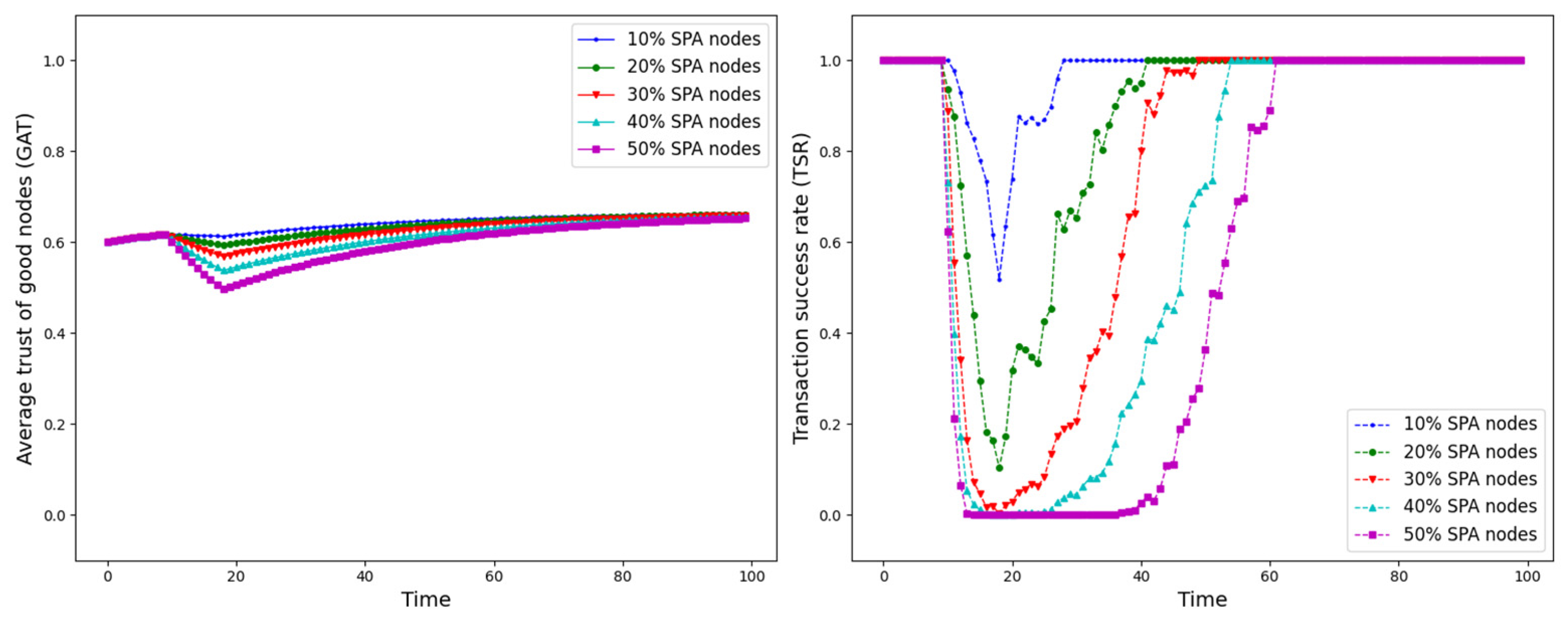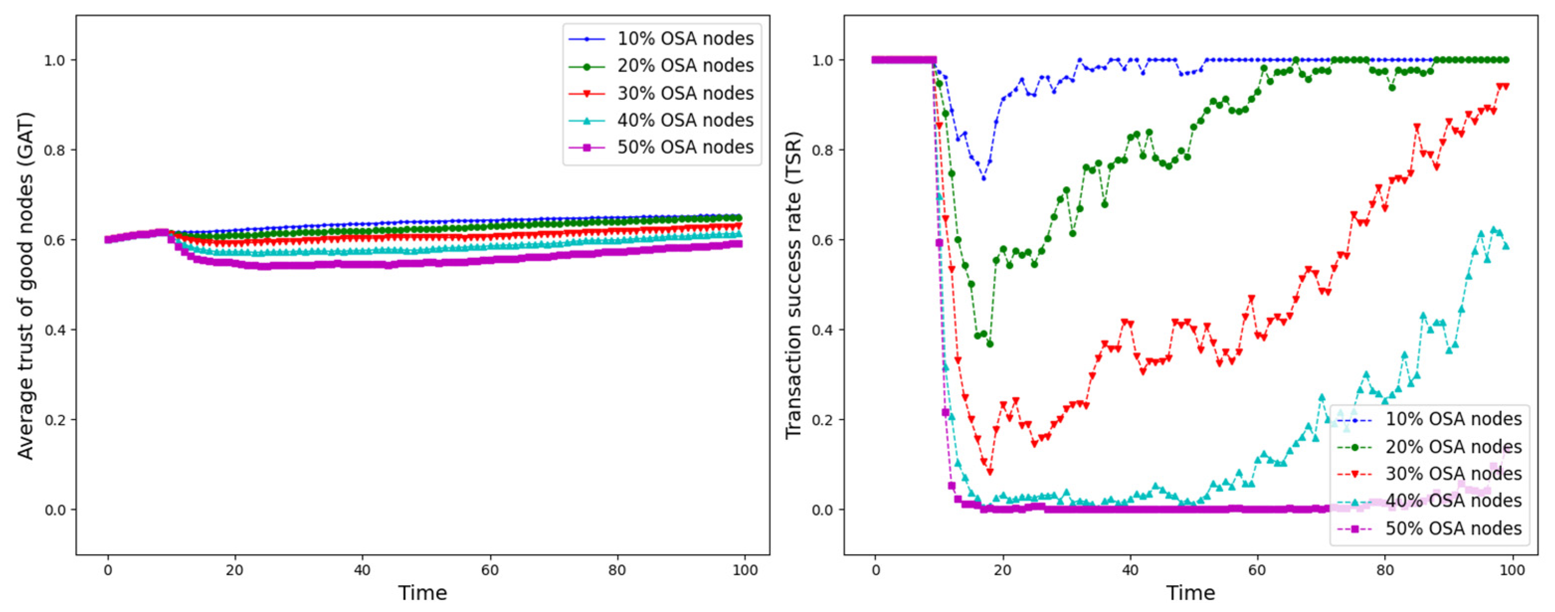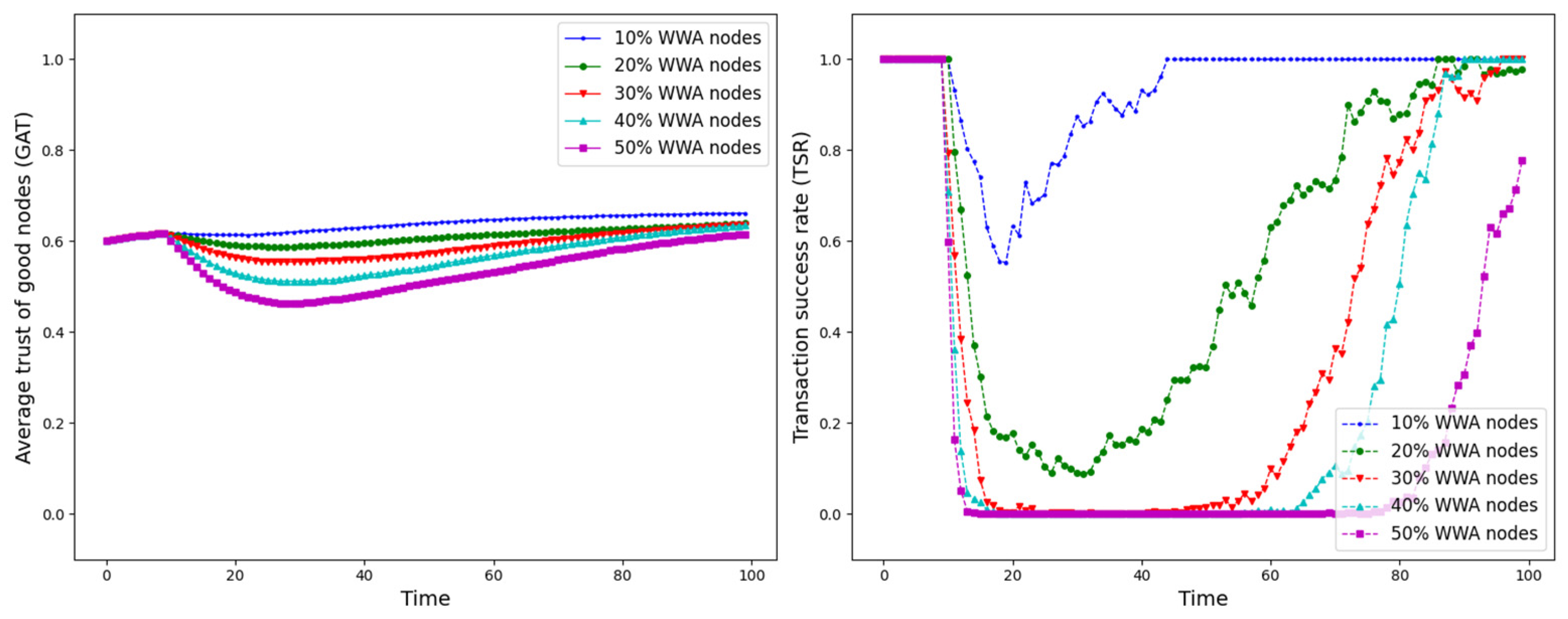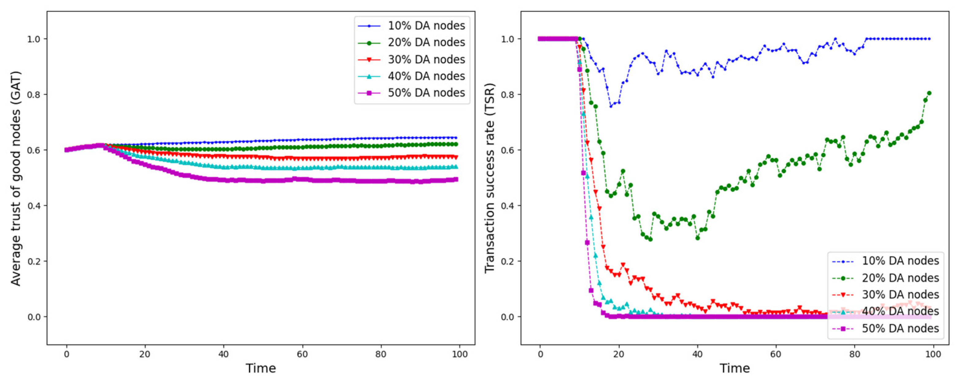 - Simulation comparison metrics: during the simulation, we record the average trust value (GAT) and transaction success rate (TSR) of good nodes. GAT measures how severely trust attacks damage honest nodes’ reputation, while TSR captures their impact on network functionality and operational efficiency. Both metrics are computed as in Equations (7) and (8).where denotes the percentage of attacking nodes, N denotes the total number of nodes in the network, then denotes the number of good nodes in the network, and denotes the trust value of the ith good node. In Equation (8), STN represents the number of successful transactions, and TN denotes the total number of interactions among nodes at a given time step.