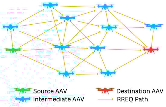 During route discovery, broadcast-based protocols such as AODV may generate a large volume of redundant control packets, especially at high AAV densities. This redundancy can account for 70–80% of total network traffic, leading to congestion and higher energy consumption, as illustrated in Figure 1.