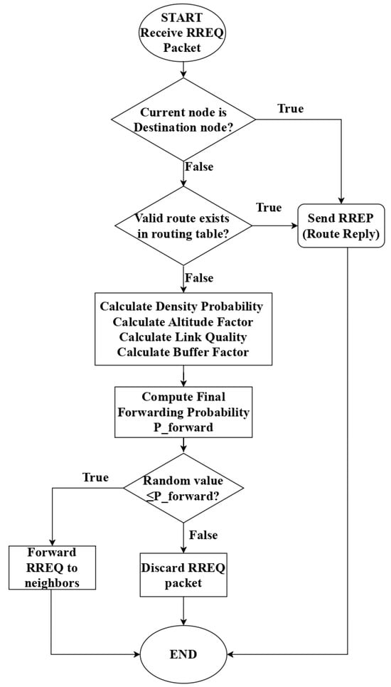 where is the current neighbor count. However, directly applying Equation (2) in highly dynamic AAV topologies would cause to fluctuate sharply whenever changes by only one or two nodes, which is very common as AAVs move in three dimensions. To obtain more robust behavior while preserving the decreasing trend of with , SHARP-AODV discretises the density space into three regimes using the thresholds and . When , the network is considered sparse and forwarding is mandatory () to avoid route discovery failures. For medium densities , the probability is reduced to 0.7 as a compromise between coverage and redundancy. In dense neighborhoods , the probability is further lowered to 0.5, which effectively suppresses the broadcast storm while keeping several candidate forwarders inside each radio cell. This discretised rule is therefore a practical instantiation of the theoretical model in Equation (2) with .