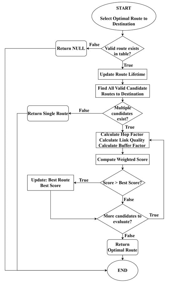 The one-second sliding window aggregates ten samples every 100 milliseconds, which is fine enough to capture congestion dynamics without capturing transient fluctuation. At each decision point upon receiving an RREQ, the node computes the average buffer occupancy ratio of the latest examples in the window, which smooths out transient spikes caused by burst arrivals while continuing to respond to persistent congestion patterns. This time-averaged utilization ratio enables the protocol to distinguish between transient bursts of traffic, for which it is not worth modifying forwarding behavior, and chronic congestion states that require adaptive reaction. The window size of one second is chosen according to empirical experience showing that it presents a good balance: smaller windows (e.g., 200–500 ms) are too sensitive to temporary fluctuations and cause unstable forwarding choices, and large windows (e.g., 2–3 s) are too sluggish and fail to respond quickly enough to arriving congestion in the dynamically changing AAV network where topology and traffic patterns continuously change.