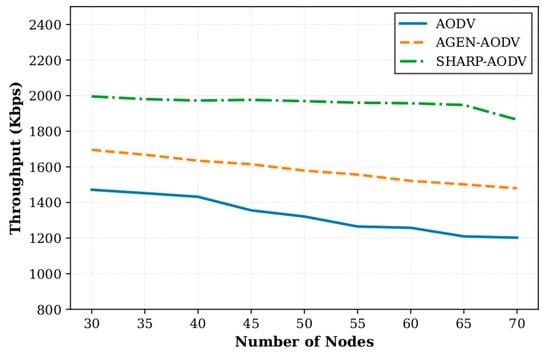 Figure 4 demonstrates that SHARP-AODV generally achieves higher PDR across node densities from 30 to 70, particularly excelling in medium-density scenarios (45–55 nodes) where it maintains PDR between 54.69% and 63.20%, outperforming AODV by 4.32–5.03 percentage points and AGEN-AODV by 2.20–2.93 percentage points. The maximum advantage occurs at 55 nodes with SHARP-AODV achieving 54.69% versus AODV’s 49.66% and AGEN-AODV’s 51.76%. At high densities (60–70 nodes), where radio channel congestion intensifies, SHARP-AODV maintains 46.00–51.51% PDR while AODV degrades to 43.70–47.20% and AGEN-AODV reaches 44.56–48.68%, confirming the effectiveness of intelligent adaptive RREQ forwarding in mitigating broadcast storms. Figure 5 reveals dramatic throughput advantages, with SHARP-AODV maintaining a stable 1864.93–1995.70 Kbps (only 6.6% degradation) compared to AODV’s severe decline from 1471.50 to 1202.27 Kbps (18.3% reduction) and AGEN-AODV’s 1479.63–1695.55 Kbps (12.7% reduction). At 65 nodes, SHARP-AODV achieves 1947.67 Kbps, representing 61.0% improvement over AODV and 29.7% over AGEN-AODV, attributable to reduced control overhead and congestion-aware path selection.