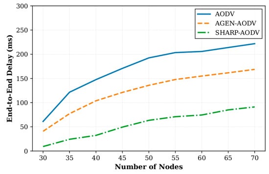 In Scenario 1, we compared the performance of SHARP-AODV, classic AODV and AGEN-AODV by varying the number of AAV nodes from 30 to 70 (in steps of 5 nodes). All nodes used the Gauss–Markov mobility model with a speed of 20 m/s. Key results are shown in Figure 4, Figure 5, Figure 6 and Figure 7.