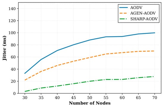 Figure 6 illustrates SHARP-AODV’s exceptional ultra-low latency performance, maintaining delay within 9.23–91.10 ms across all densities while AODV exhibits near-exponential growth from 61.04 to 221.86 ms and AGEN-AODV ranges 40.76–168.70 ms. At 30 nodes, SHARP-AODV achieves 84.9% delay reduction versus AODV and 77.4% versus AGEN-AODV; even at maximum density (70 nodes), SHARP-AODV’s 91.10 ms represents 58.9% and 46.0% improvements, respectively, consistently remaining below the critical 100 ms threshold for real-time applications. This stems from rapid route establishment, stability-prioritized path selection reducing rediscovery frequency, and buffer-aware congestion avoidance. Figure 7 demonstrates remarkable jitter stability, with SHARP-AODV maintaining 3.18–27.84 ms compared to AODV’s severe deterioration from 33.03 to 99.90 ms (202.5% increase) and AGEN-AODV’s 21.91–69.95 ms. At 30 nodes, SHARP-AODV achieves 90.4% jitter reduction versus AODV and 85.5% versus AGEN-AODV, while at 70 nodes maintaining 72.1% and 60.2% reductions, respectively, enabled by multi-criteria path selection prioritizing link quality (50% weight) for channel consistency.