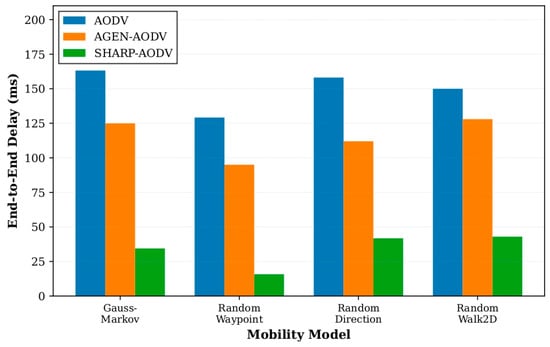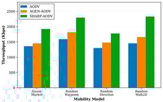 The consolidated outcomes for all four mobility patterns are depicted in Figure 8, Figure 9, Figure 10 and Figure 11, demonstrating that SHARP-AODV delivers consistently superior and more stable performance than both baseline AODV and AGEN-AODV across every critical metric: PDR, throughput, delay, and jitter. Figure 8 reveals that SHARP-AODV maintains higher PDR across all mobility models, with the most pronounced improvements observed in highly stochastic scenarios such as RandomWalk2D and RandomWaypoint where topology changes are most severe and unpredictable, outperforming AODV substantially while maintaining measurable advantages over AGEN-AODV’s adaptive mechanisms. Figure 9 illustrates that SHARP-AODV sustains substantially higher network throughput regardless of mobility pattern, with the performance gap widening most dramatically under chaotic movement models where classical AODV suffers from excessive broadcast storms and frequent route failures, while AGEN-AODV shows moderate improvement but still falls short of SHARP-AODV’s AAV-optimized approach.