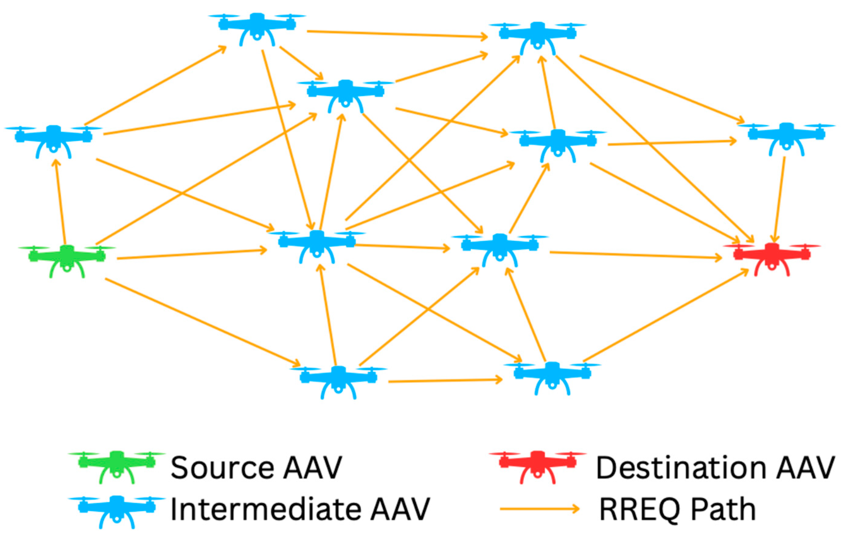 - SHARP-AODV provides an intelligent RREQ dissemination scheme that unites density sensitivity with a multi-parameter probabilistic model. The scheme considers four factors: (1) local neighborhood density via a three-level discrete model based on the optimal-coverage principle; (2) flight altitude to leverage enhanced coverage using higher altitudes; (3) channel quality calculated based on relative velocity and estimated distance; and (4) routing-buffer status using a sliding-window approach to avoid congestion. This approach greatly reduces the broadcast-storm effect in route discovery, reducing redundant control traffic by 70–80% to less than 30%, yet preserves enough coverage to guarantee a high probability of path discovery, especially in dense and high-speed-changing AAV topologies.