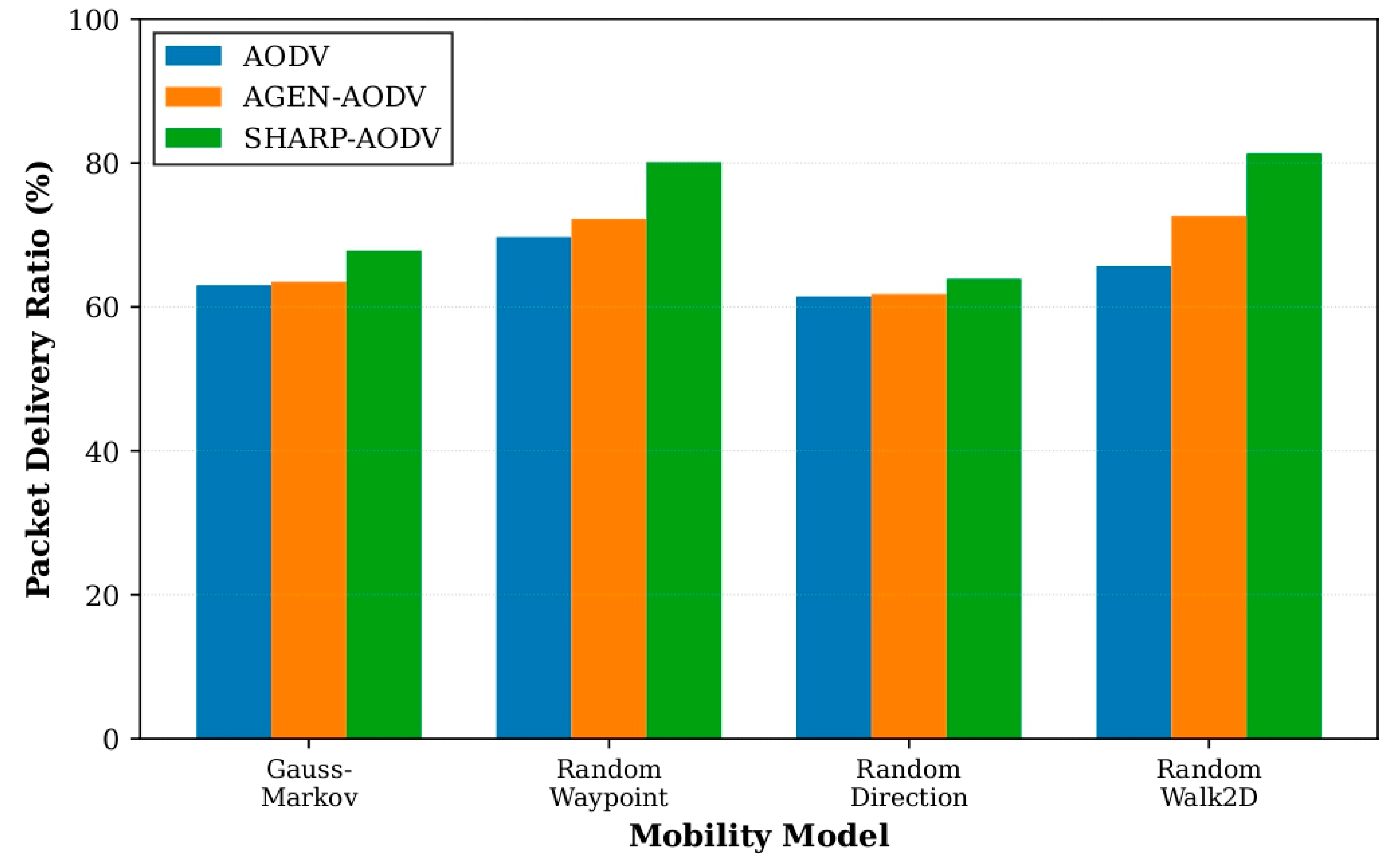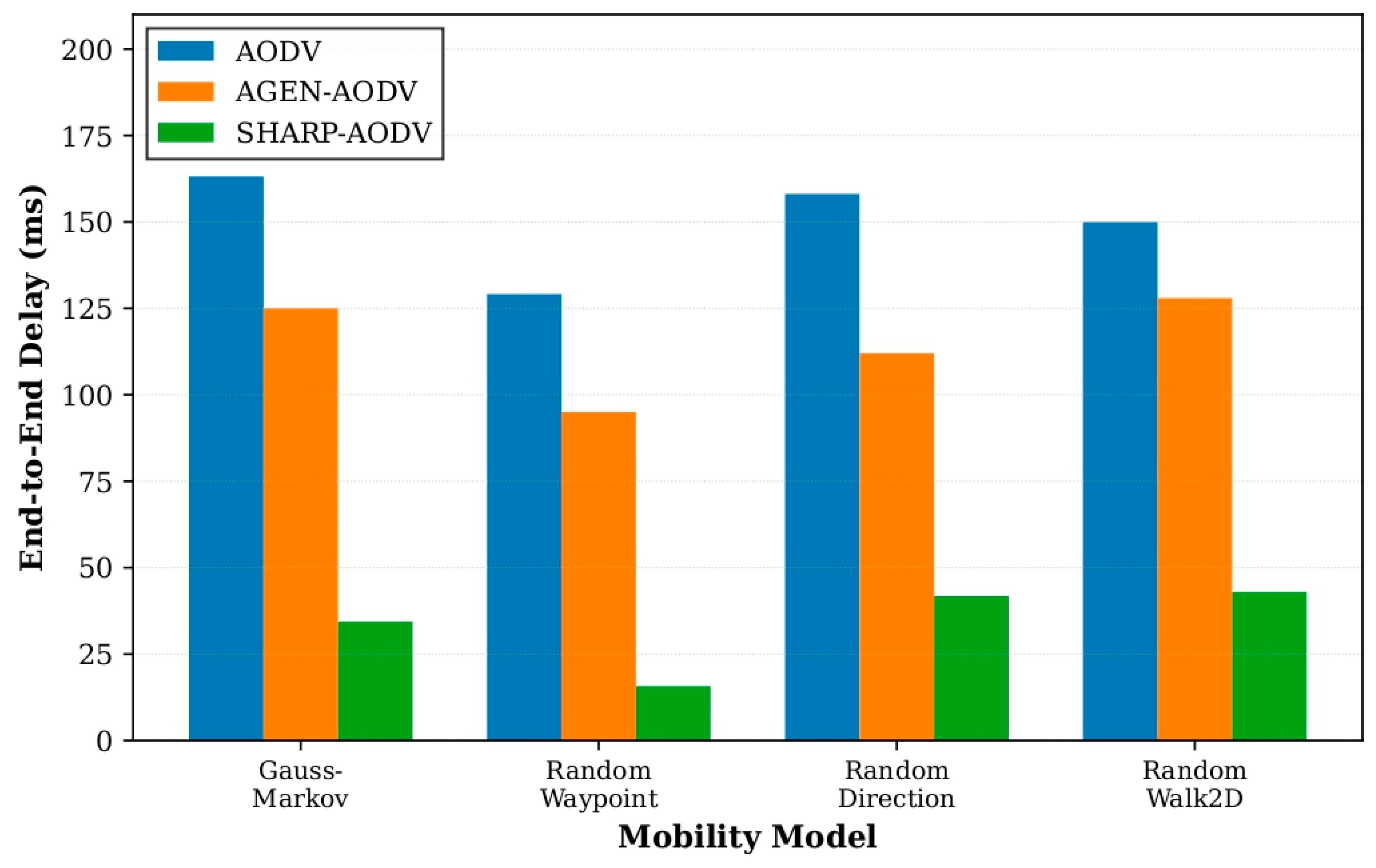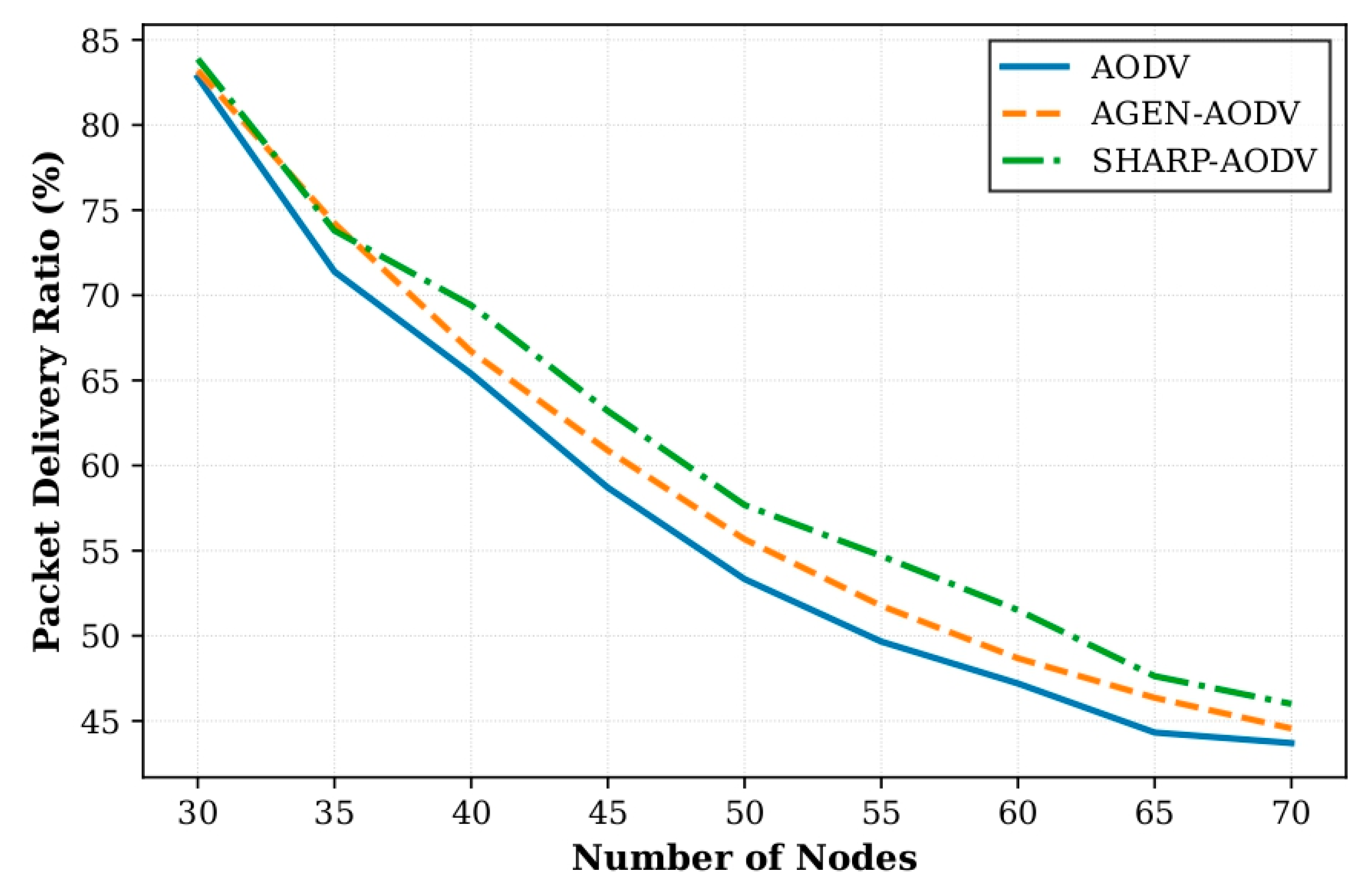 - Moreover, by lowering control overhead and selecting energy-efficient routes, SHARP-AODV significantly extends AAV autonomous operation by an estimated 15–25%, which is especially valuable for large-scale, long-duration deployments such as environmental monitoring, disaster management, and augmentation of mobile network infrastructure.