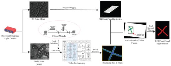 This paper utilizes a binocular structured-light camera to acquire two modal data types of the workpiece—2D images and 3D point clouds—and proposes a weld seam detection and segmentation method based on the fusion of active and passive vision. As illustrated in Figure 1, the proposed approach mainly consists of two steps: weld seam image instance segmentation and weld seam ROI point cloud segmentation. In the weld seam image instance segmentation stage, to enhance the localization accuracy of the weld seam region and the extraction quality of the mask map, an improved segmentation algorithm is designed by integrating the convolutional block attention module (CBAM) into the YOLOv8n-seg model. In the weld seam ROI point cloud segmentation stage, the 3D point cloud is first mapped onto the 2D pixel plane using a calibrated parameter matrix to achieve spatial alignment between point cloud coordinates and pixel coordinates. Subsequently, using the weld seam ROI bounding boxes output from the instance segmentation stage as boundaries, a coarse screening of the projected point cloud is performed to rapidly eliminate a large number of redundant point clouds in non-weld seam regions. Finally, a fine screening operation is executed: a grayscale matrix is constructed based on the high-precision mask maps generated by the instance segmentation, and point-wise discrimination is applied to the coarsely screened point cloud to further remove interfering points outside the mask region, ultimately achieving precise segmentation of the weld seam ROI point cloud.