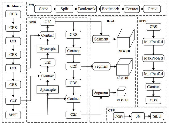 YOLOv8, part of the YOLO model family, is designed for tasks such as object detection, instance segmentation, and classification. YOLOv8n-seg is the most “lightweight” model in this series for instance segmentation, requiring minimal parameters and computational resources. The network structure of the YOLOv8n-seg model [26] consists of the following components, as illustrated in Figure 2: input layer, backbone network, neck network, and output head. The backbone is composed of modules such as CBS convolution, C2f, and SPPF, arranged sequentially to extract multi-scale and multi-category instance features from images. The neck network adopts the classical PAFPN architecture [27] from YOLOv5, ensuring robust feature fusion across scales. The output head provides both object detection bounding boxes and segmentation mask information.