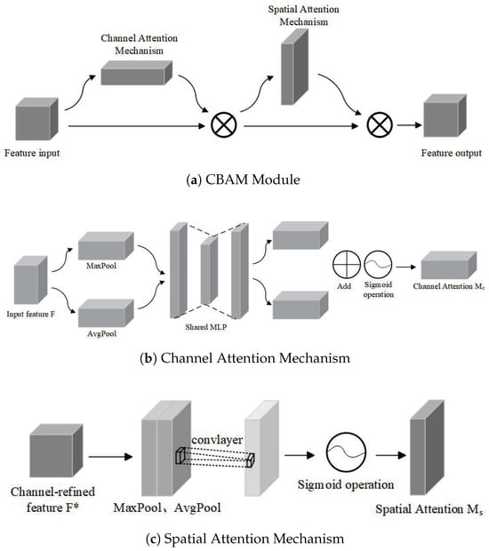 The spatial attention mechanism (SAM) first performs channel-based global max pooling and average pooling operations, followed by concatenation along the channel dimension. A 7 × 7 convolution operation is then applied to the concatenated feature map for further processing, generating a feature map with a channel dimension of 1. Finally, the Sigmoid activation function generates the spatial attention feature weight matrix . The spatial attention mechanism can be formulated as follows: