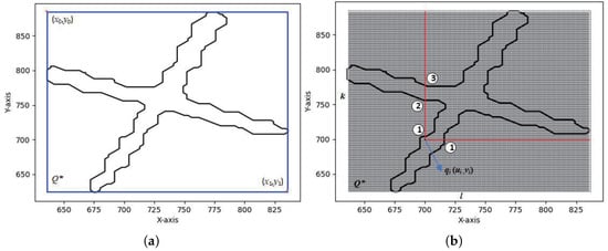From the position , a ray is drawn in both the horizontal and vertical directions. The number of pixels with a grayscale value of 0 in each ray within the matrix is recorded as . According to the ray-casting method, if is odd for any ray, the pixel point corresponds to a point that belongs to the weld seam ROI region; otherwise, it does not, as shown in Figure 5b.