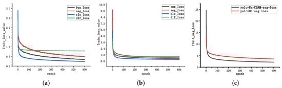 A comparison of training loss curves between YOLOv8n-seg and the proposed YOLOv8n-cbam-seg model. (a) YOLOv8n-seg network training loss value; (b) YOLOv8n-cbam-seg network training loss value; (c) The comprehensive loss value of each model.