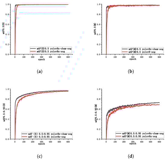 Variation curves of mAP values for different categories. (a) mAP0.5(B) value; (b) mAP0.5(M) value; (c) mAP0.5:0.95(B) value; (d) mAP0.5:0.95(M) value.