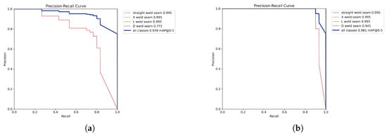To further analyze model performance across different decision thresholds, Figure 9 presents the precision–recall (PR) curves of both models. It can be observed that the PR curve of YOLOv8n-CBAM-seg lies closer to the upper-right corner of the coordinate plane and exhibits a larger area under the curve (AUC) across all categories, indicating its ability to maintain a superior balance between precision and recall under varying confidence thresholds. Notably, for the D-shaped weld seams—characterized by complex geometry and high segmentation difficulty—the proposed model achieves a 16.9% improvement in average precision (AP) compared to the baseline. This enhancement, coupled with the capability of the PR curve to sustain high precision at high recall rates, is particularly critical for industrial applications such as weld inspection where missed detections are unacceptable. It demonstrates that the model ensures the identification of all actual weld seams while effectively reducing the risk of false positives.