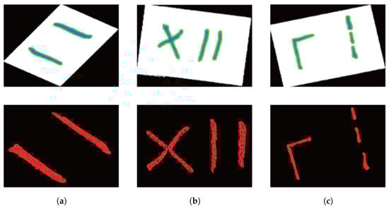 This study employs an Elson binocular line-scan structured-light camera with a baseline distance of 200 mm and a resolution of 1920 × 1200 pixels. System calibration was performed using Zhang’s calibration method in conjunction with a standard checkerboard, achieving a mean reprojection error of 0.15 ± 0.03 pixels. Data were acquired at a typical working distance of 600 mm, with the system covering a field of view of 640 × 400 mm. As shown in Figure 6, four types of small-target overlay weld specimens were designed—I-shaped, X-shaped, L-shaped, and three-segment discontinuous D-shaped—yielding a total of 40 randomly combined weld seam samples. Each scanned dataset includes a 2D image and its corresponding 3D point cloud. Diverse data were obtained by varying lighting conditions, shooting distance, angle, workpiece type, and position to simulate complex industrial scenarios. The initially collected 300 weld seam images were augmented to 1800 via flipping, affine transformation, brightness adjustment, blurring, and Gaussian noise injection. All images were pixel-wise mask-annotated by experienced engineers using the LabelMe tool, with contours strictly traced along the weld seams to ensure consistency.