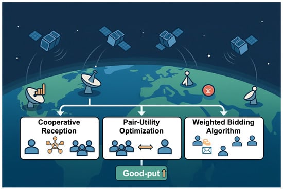Overview of the three proposed algorithms for nanosatellite-to-ground communication: (1) Cooperative Reception (Shapley-value prioritization), (2) Pair-Utility Optimization (local pairwise refinement), and (3) Weighted Bidding (price-per-message allocation).
