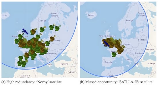 In particular, the greedy algorithm leads to redundancy. As illustrated in Figure 3a, the high-power ‘Norby’ satellite is successfully received by numerous stations simultaneously. In contrast, Figure 3b shows the lower-power ‘SATLLA-2B’ satellite, where only a single station achieves successful reception while many others do not. This comparison highlights a critical flaw: ground stations independently prioritizing the strongest signal leads to high data redundancy, risking the complete loss of transmissions from weaker satellites.