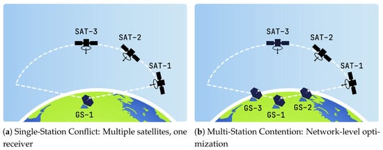 Visual representation of scheduling conflict scenarios. (a) A station faces a local exclusion constraint when multiple satellites pass simultaneously. (b) Dense orbital traffic creates complex combinatorial allocation problems across the network.