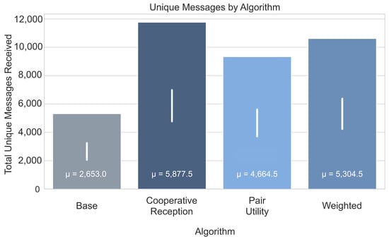 Total unique messages received by the network under different satellite selection algorithms during a 24-h simulation. The value inside each bar denotes the mean number of unique messages, and the white vertical line shows the standard deviation.