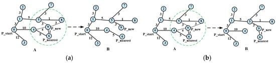 Basic principle diagram of RRT*. (a) Stage 1: Re-select Parent Nodes; (b) Stage 2: Rewire the random tree.