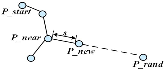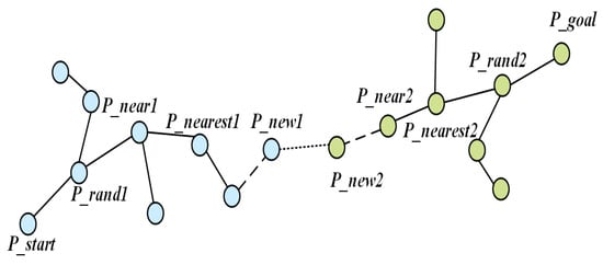 In the B-RRT* algorithm, the two trees ( and ) grow towards each other’s root ( or ) as their respective targets. New node expansion follows Figure 7 and Equation (5):