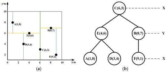 KD-tree organization and 2D space division. (a) Construction of KD-tree in 2D space; (b) organizational construction of KD-tree.