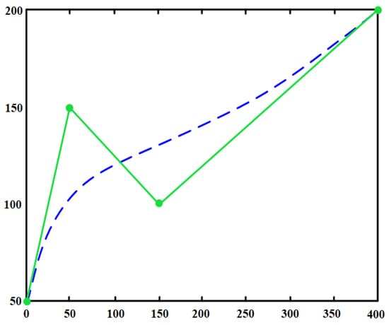 Suppose a path point sequence , a tolerance threshold , start point , and end point . The process of pruning using the DP algorithm is as follows, as shown in Figure 10.