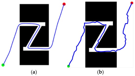 Figure 20 shows the path planning results of the four algorithms in Map2 (Section 4.1, Figure 15b) under consistent basic parameters. From the experimental results, it can be seen that KDB-RRT* (Figure 20a) generates a continuous, smooth curve navigating dense obstacle gaps, with necessary turns only at critical bottlenecks. Optimized RRT* (Figure 20b) exhibits frequent backtracking in narrow passages. RRT*-Connect (Figure 20c) produces paths with numerous sharp turns. Informed-RRT* (Figure 20d) reduces curvature changes but still features large-angle turns.