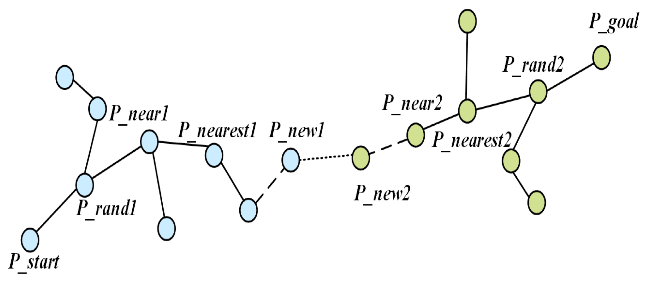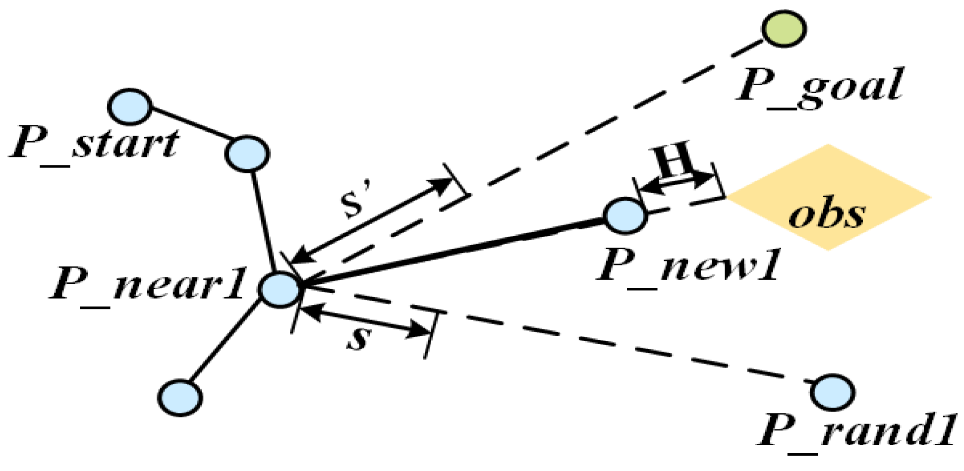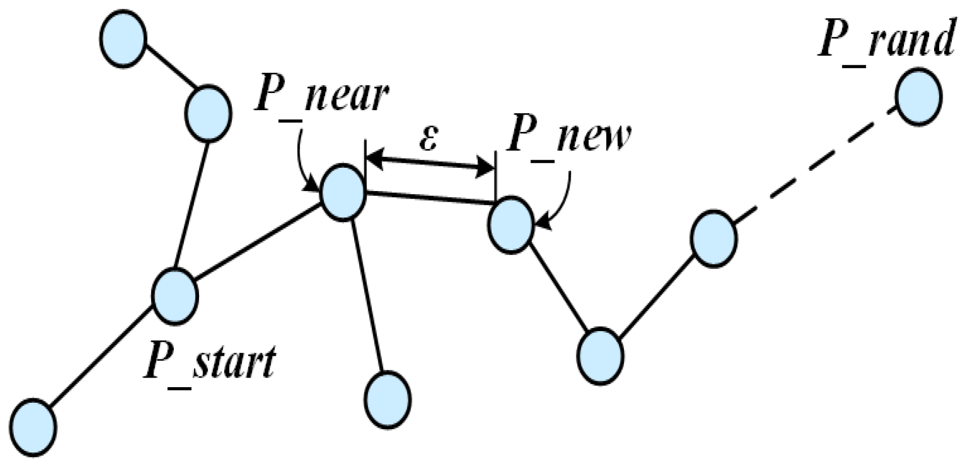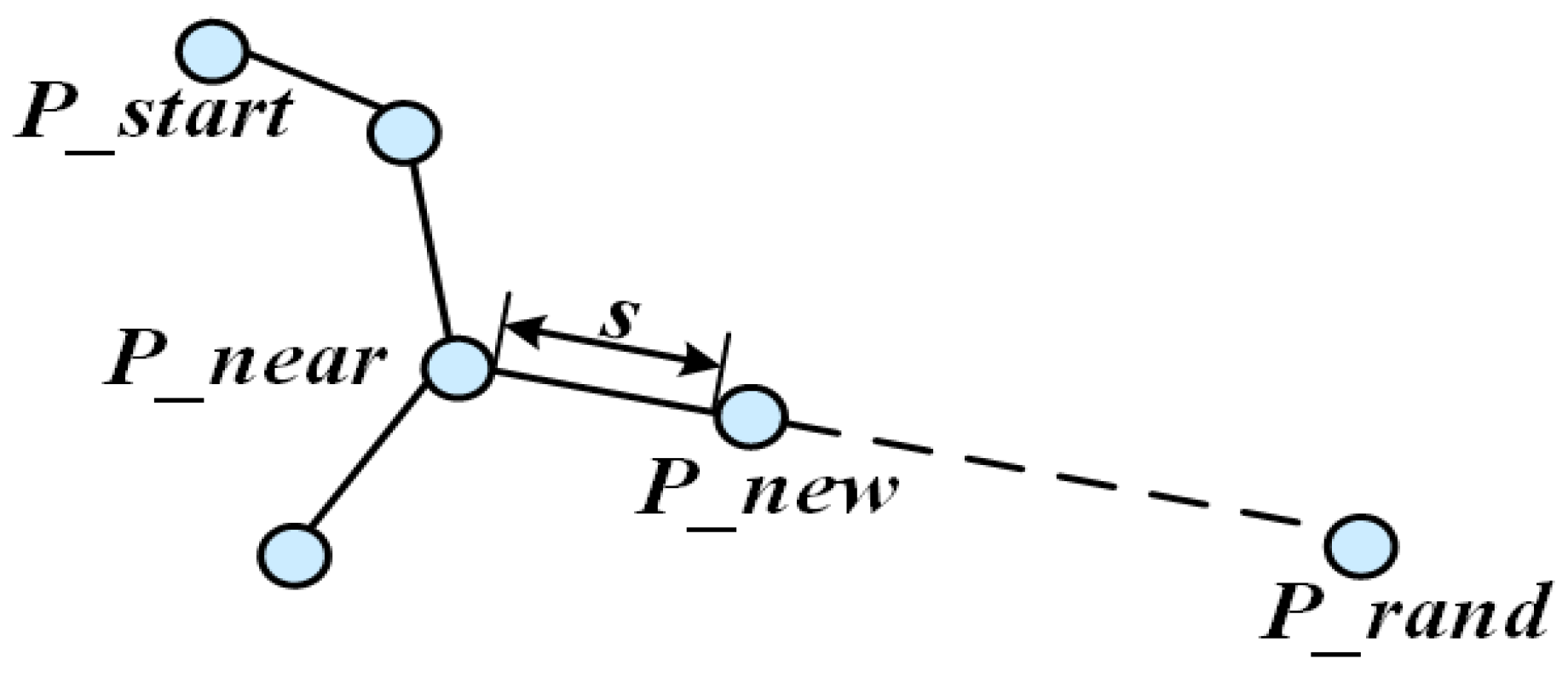 - Tree Connection: If connected, merge the trees and at the connection point to form the initial path . If not connected, return to Step 2 and continue constructing two trees.