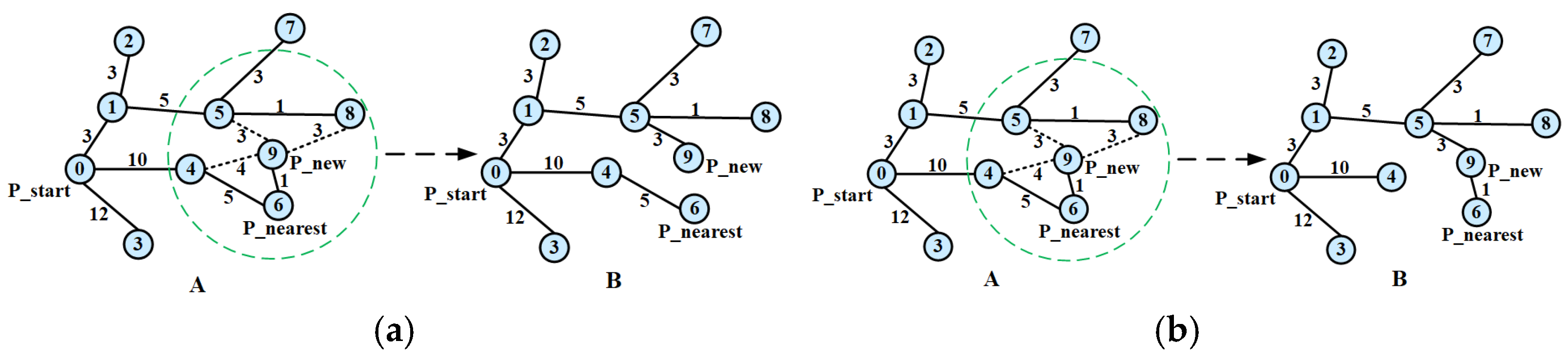 - Rewire the tree: For nodes in , check if connecting them to provides a lower-cost path. If so, rewire their parent to .