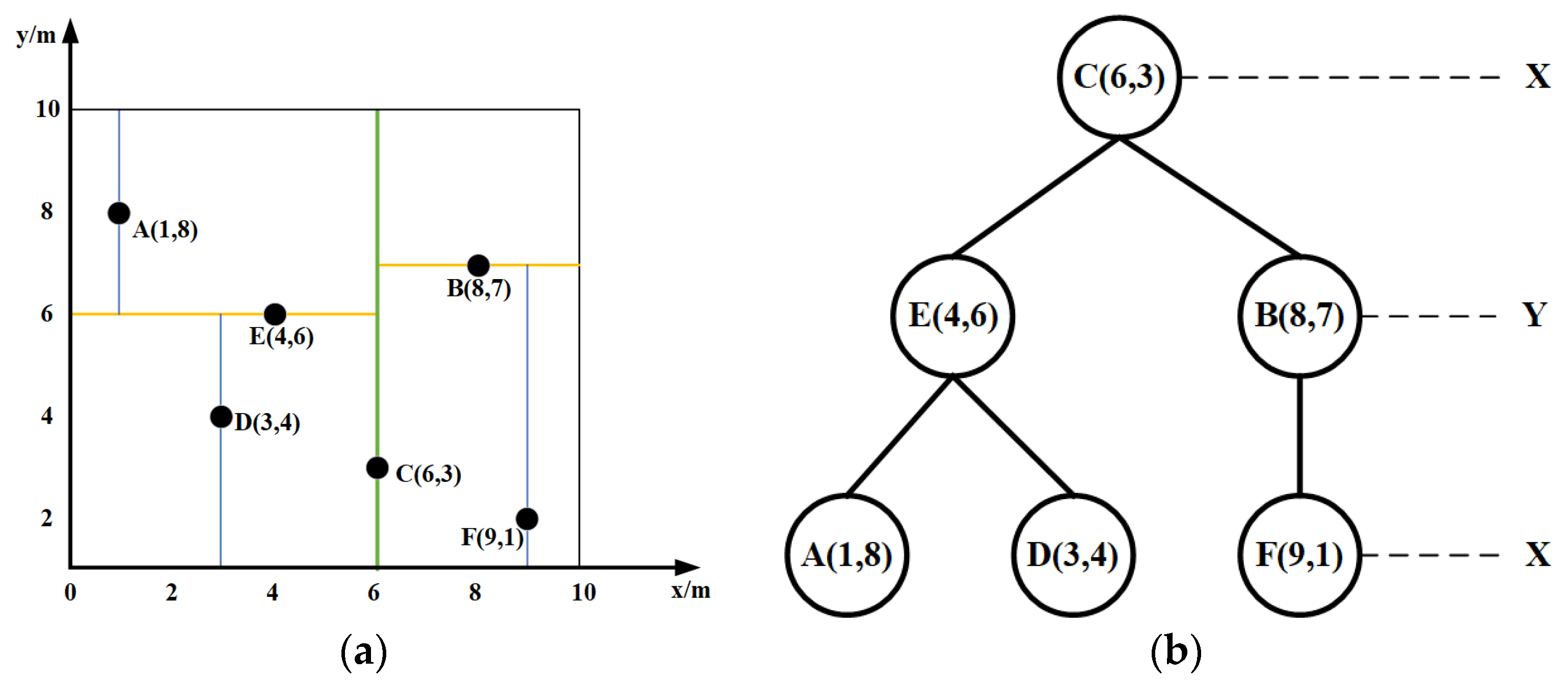 - For the right subtree {B, F}, select the y-dimension as the splitting axis. Point B (8,7) is chosen as the root node for this subtree (as it has the larger y-coordinate). This splits the subtree into right child F (9,1).
