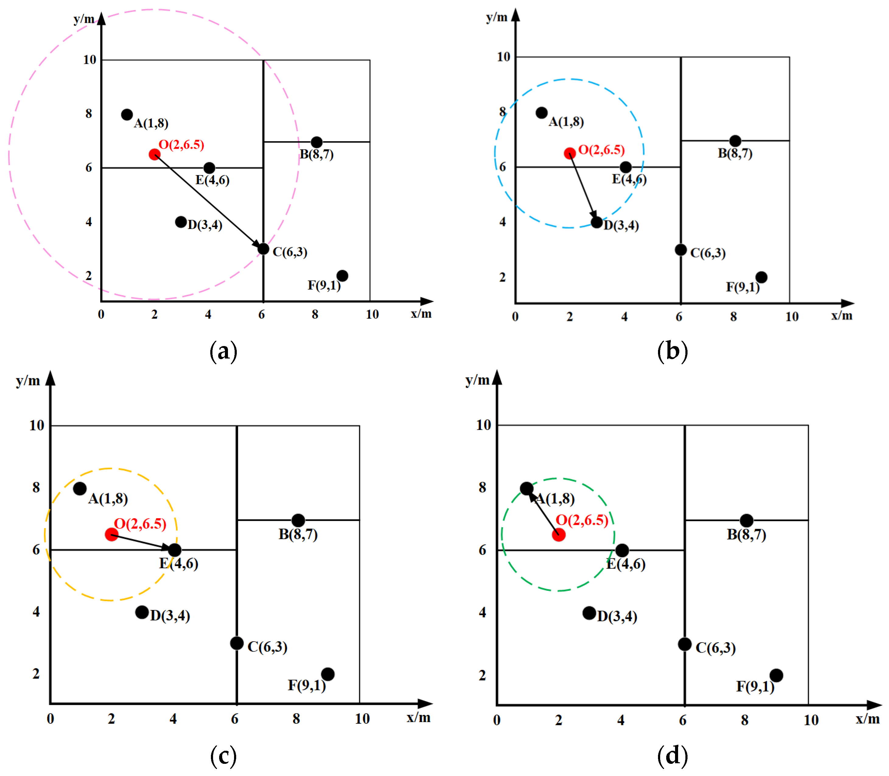- Backtrack to E (4,6), and calculate OC. Since OE < OD, update the current nearest neighbor to E (4,6). Define a new (yellow) search circle with radius OE (Figure 5c).