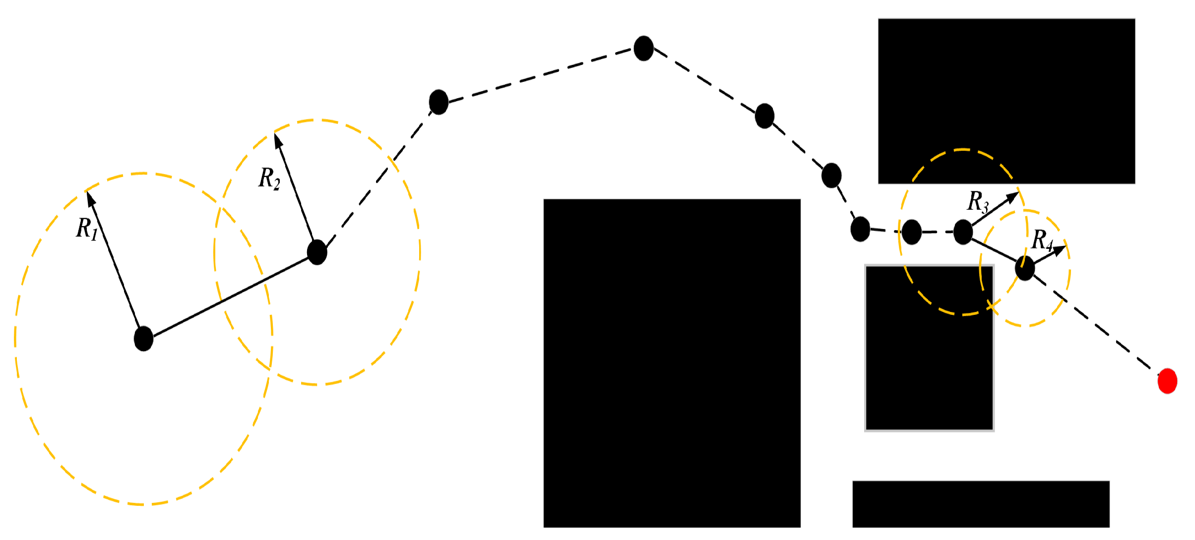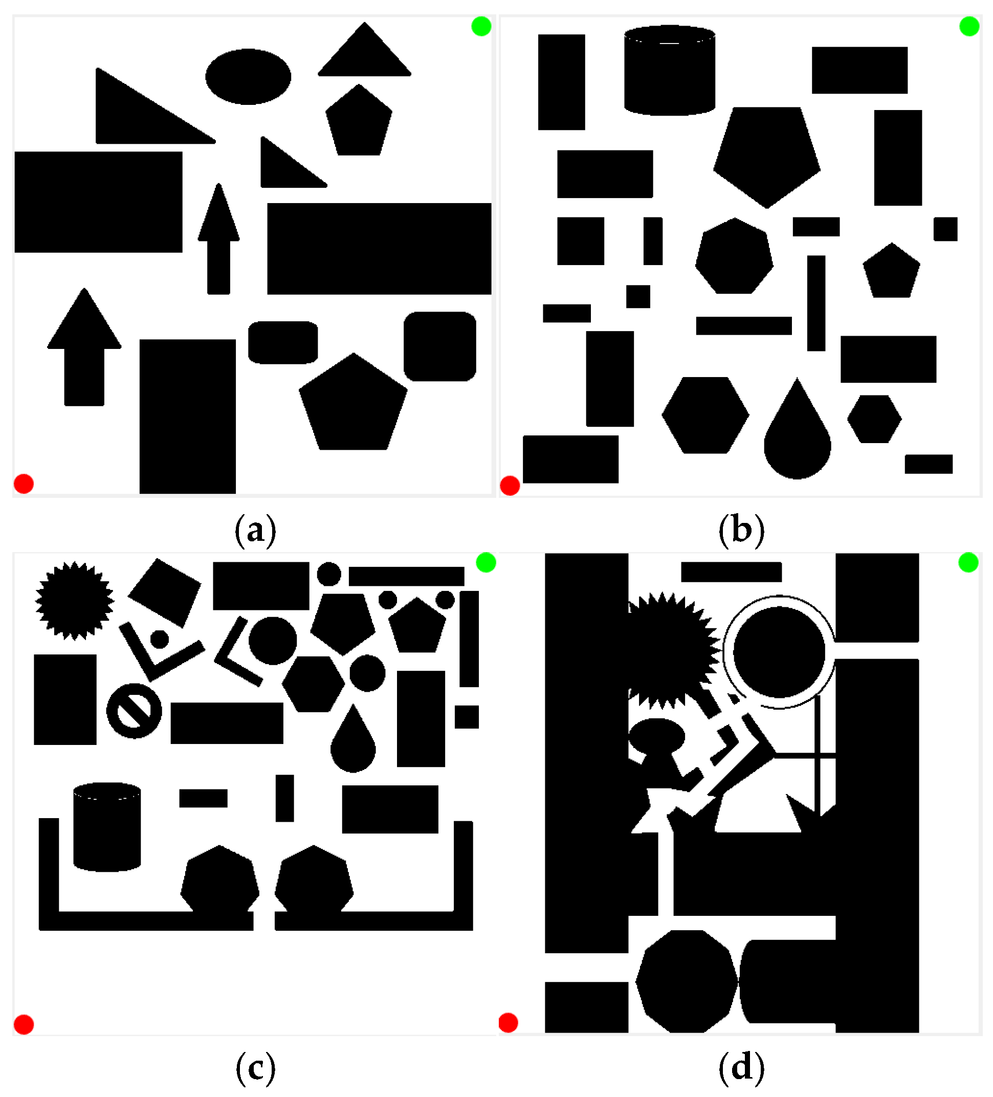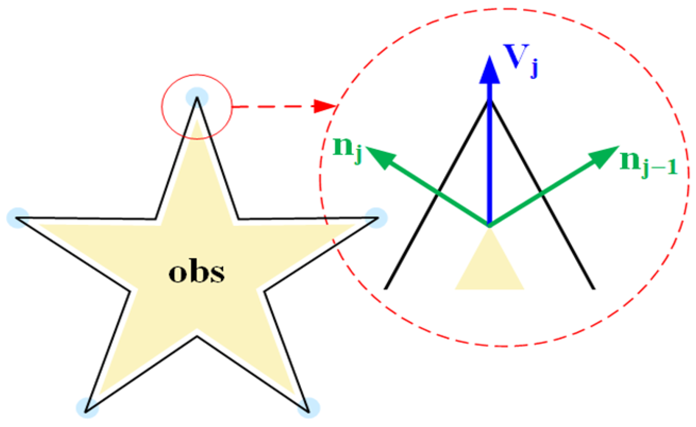 - Obstacle Modeling: In the 2D planning space, all obstacles are modeled as a set of polygons . Each obstacle is defined by an ordered sequence of vertices (vertices are arranged in a clockwise order to ensure polygon closure, with ).