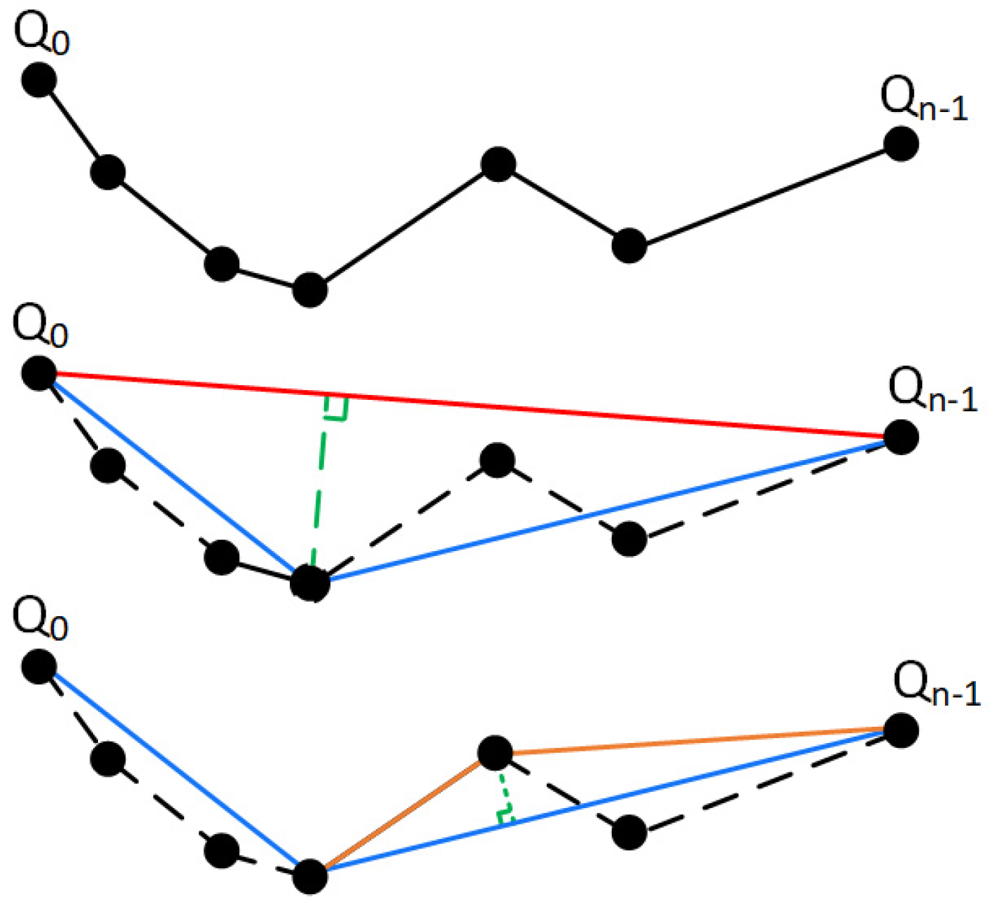 - Calculate the perpendicular distance from each intermediate point to the line segment . Find the point with the maximum distance ;