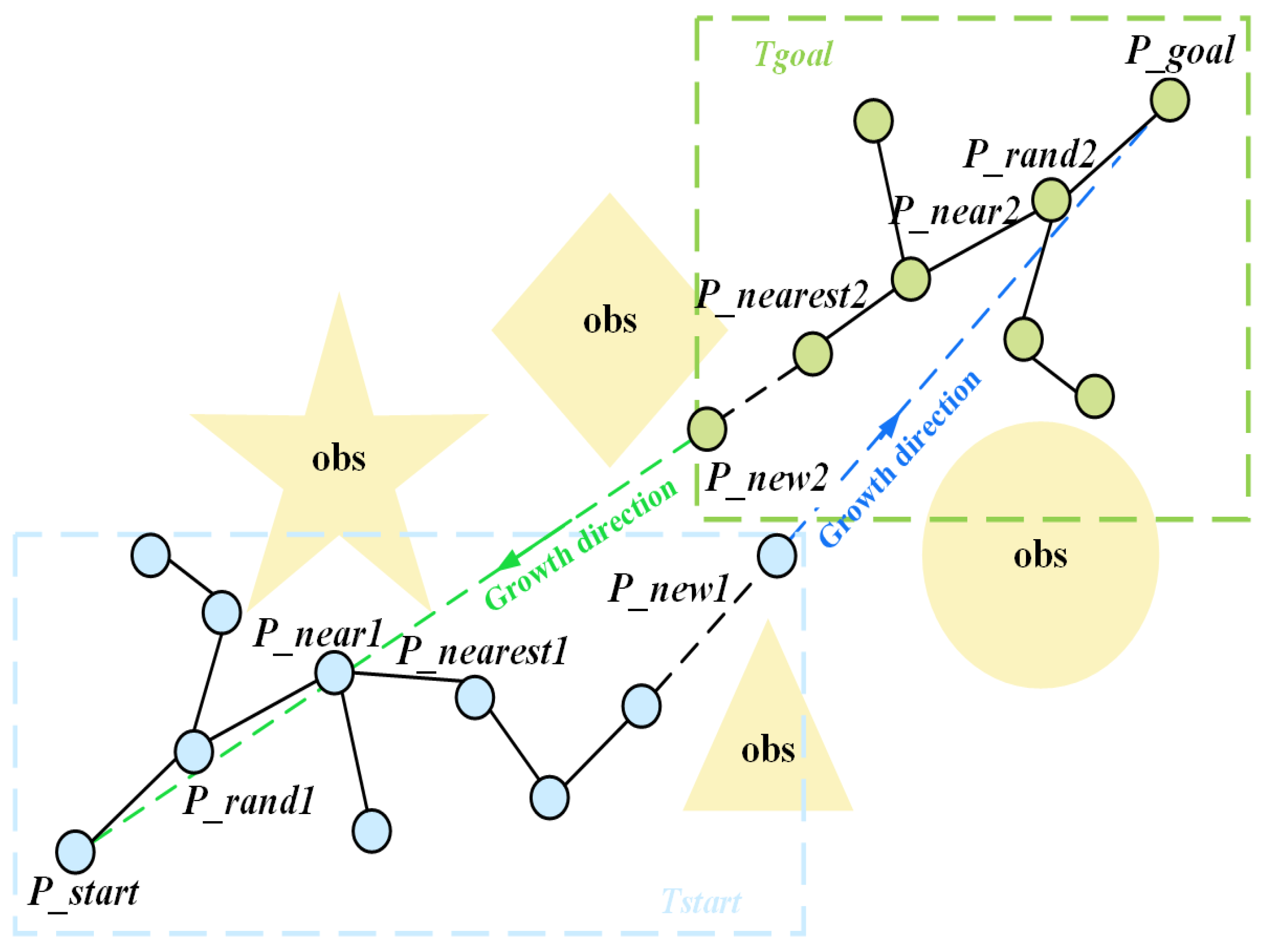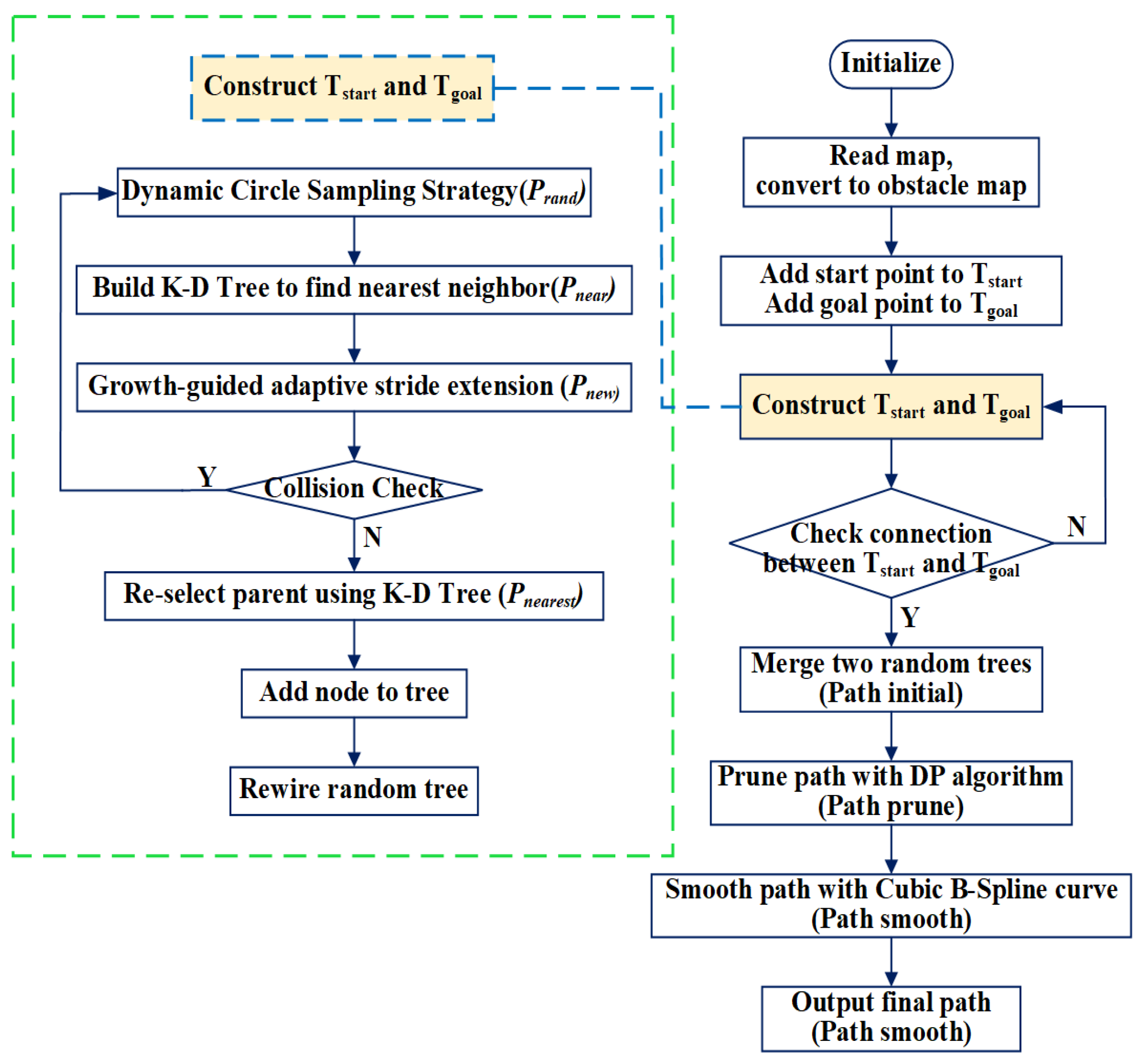 - Initialize: Map information, parameters, start (), and goal () are loaded. Initialize trees: with and with .