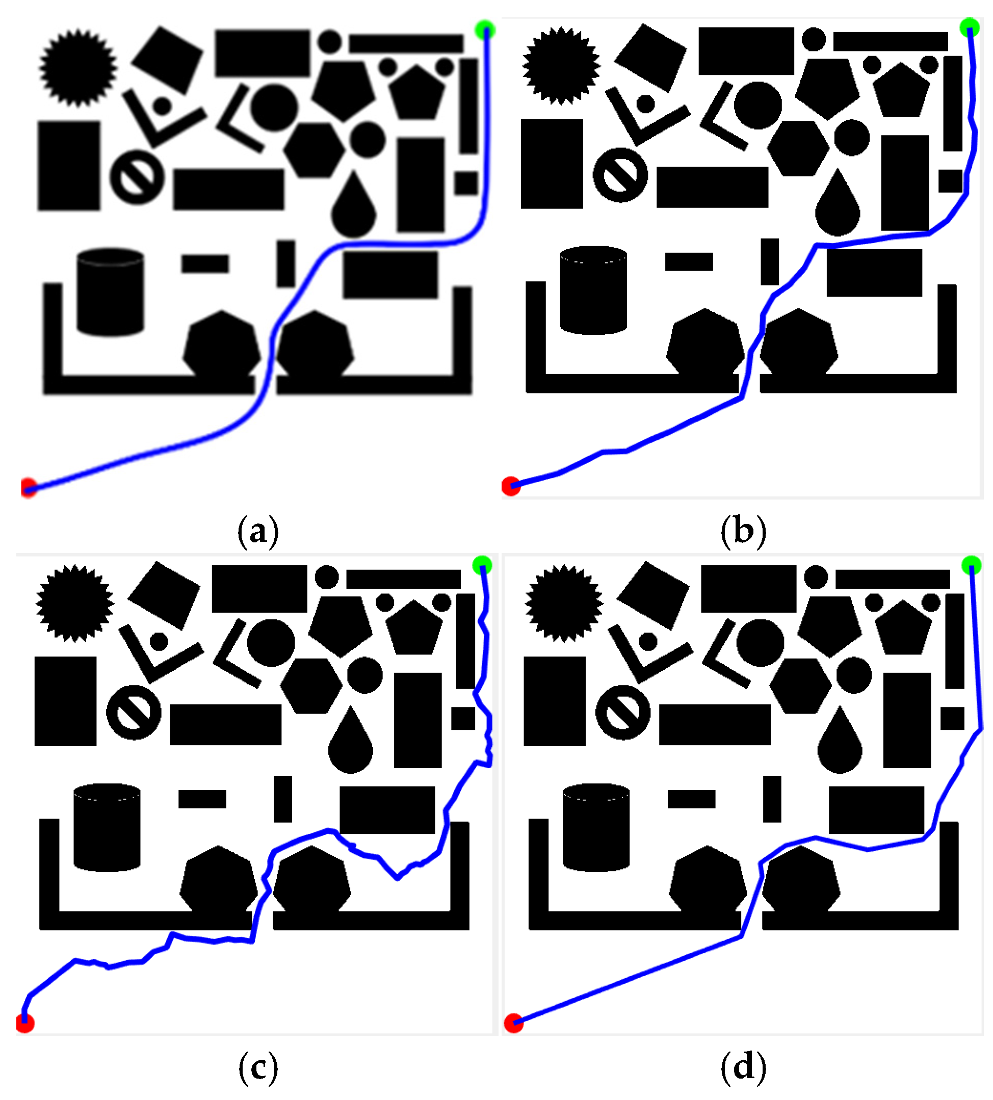 - Ma, X.Q.; Wang, H.; Liu, L.; Li, S. Adaptive path planning algorithm based on IRRT-Connect. Electron. Meas. Technol. 2024, 47, 82–88. [Google Scholar]