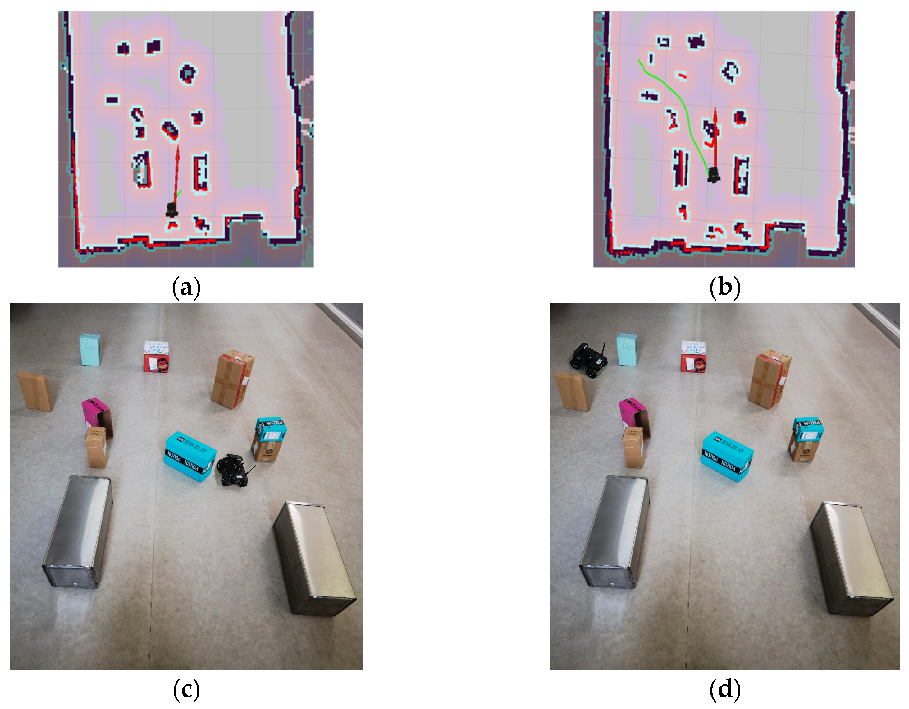 - Guo, Z.J.; Yin, Y.K.; Li, Y.X.; Yu, X.T.; Zhang, P. Mobile robot path planning integrating improved A and TEB algorithms. J. Henan Univ. Sci. Technol. 2023, 44, 57–65+7. [Google Scholar]