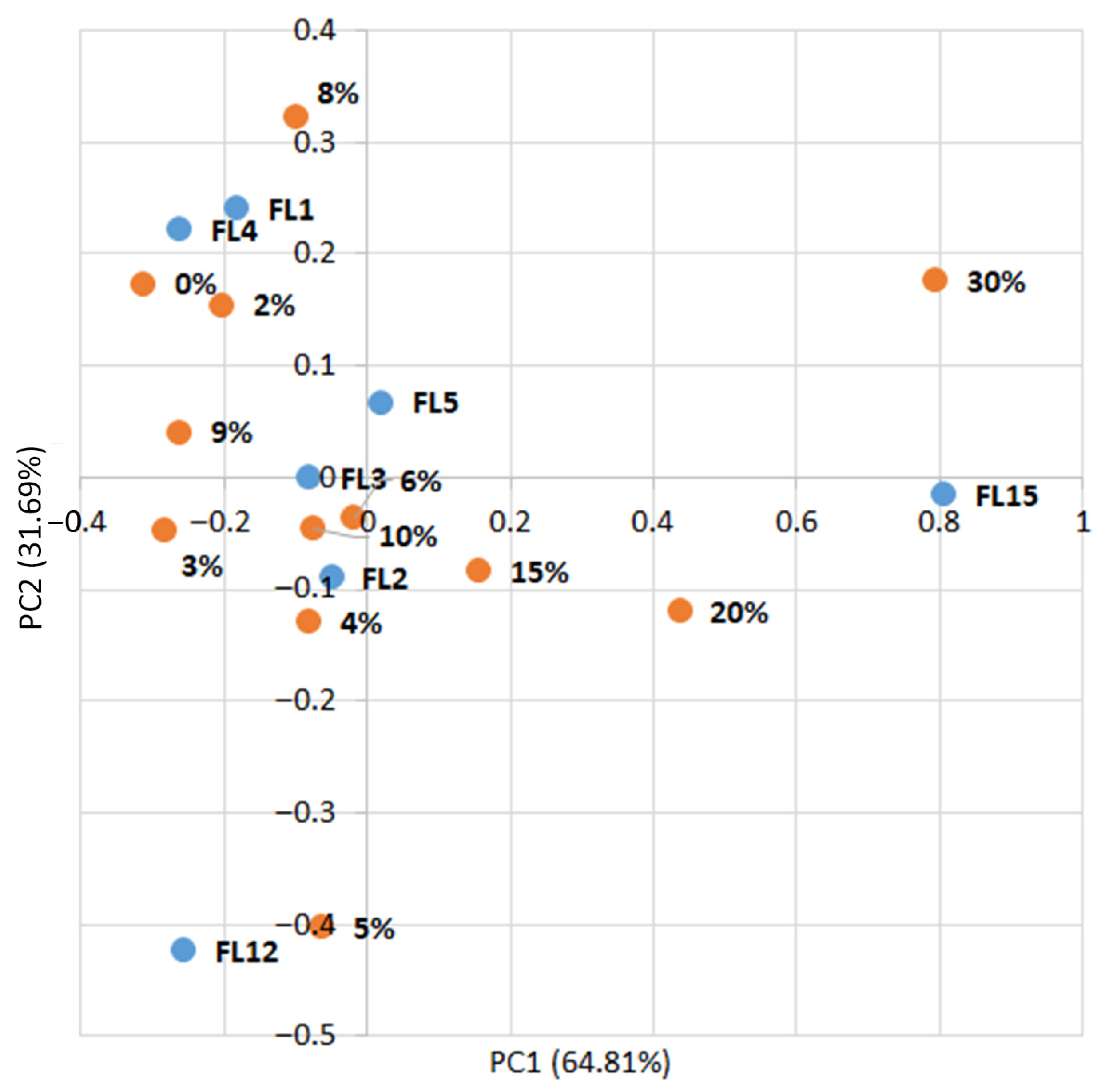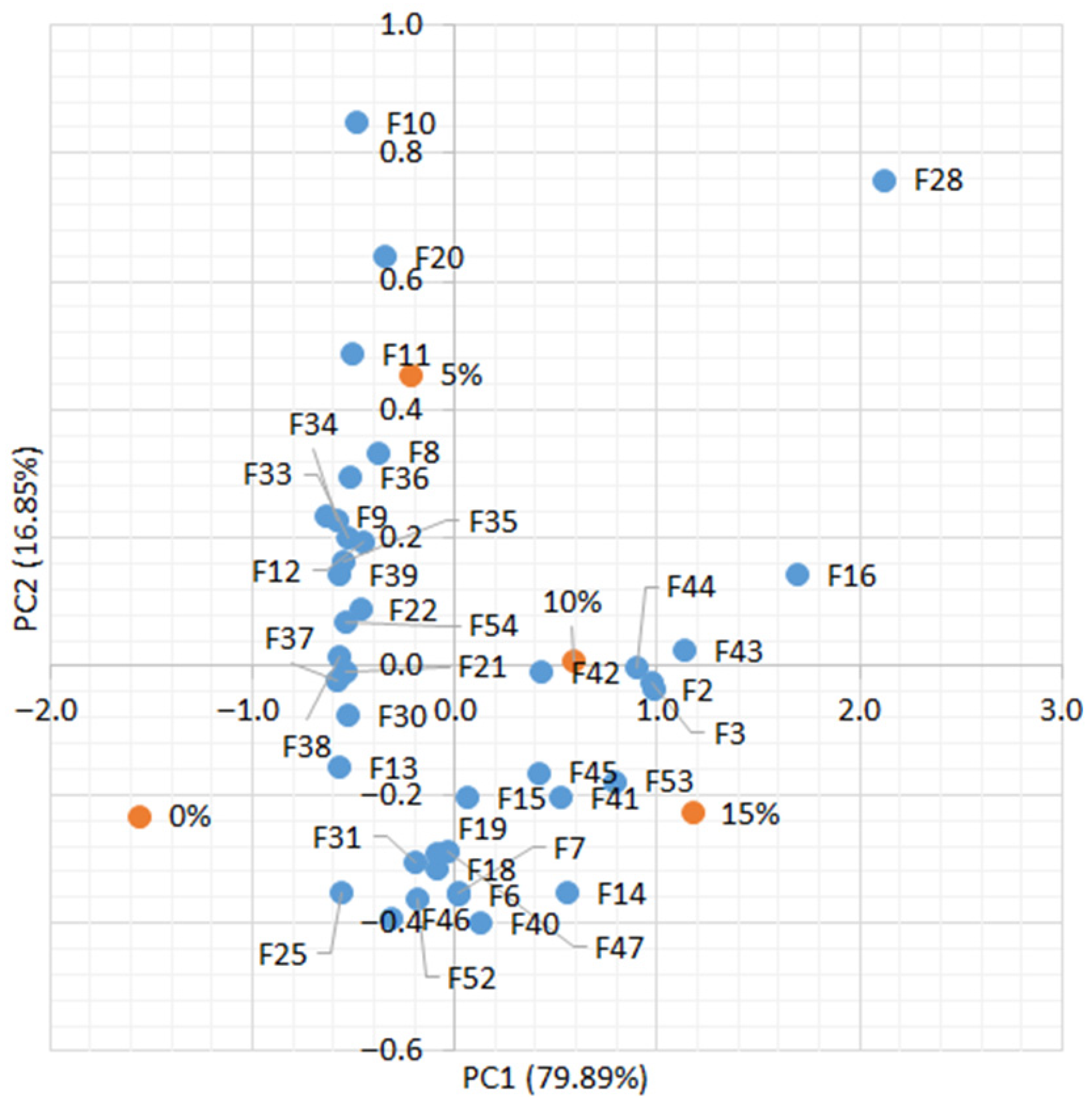 | F39 | Overall acceptance | −0.57 | 0.14 | FL5 | Overall acceptability | −0.26 | −0.37 |
