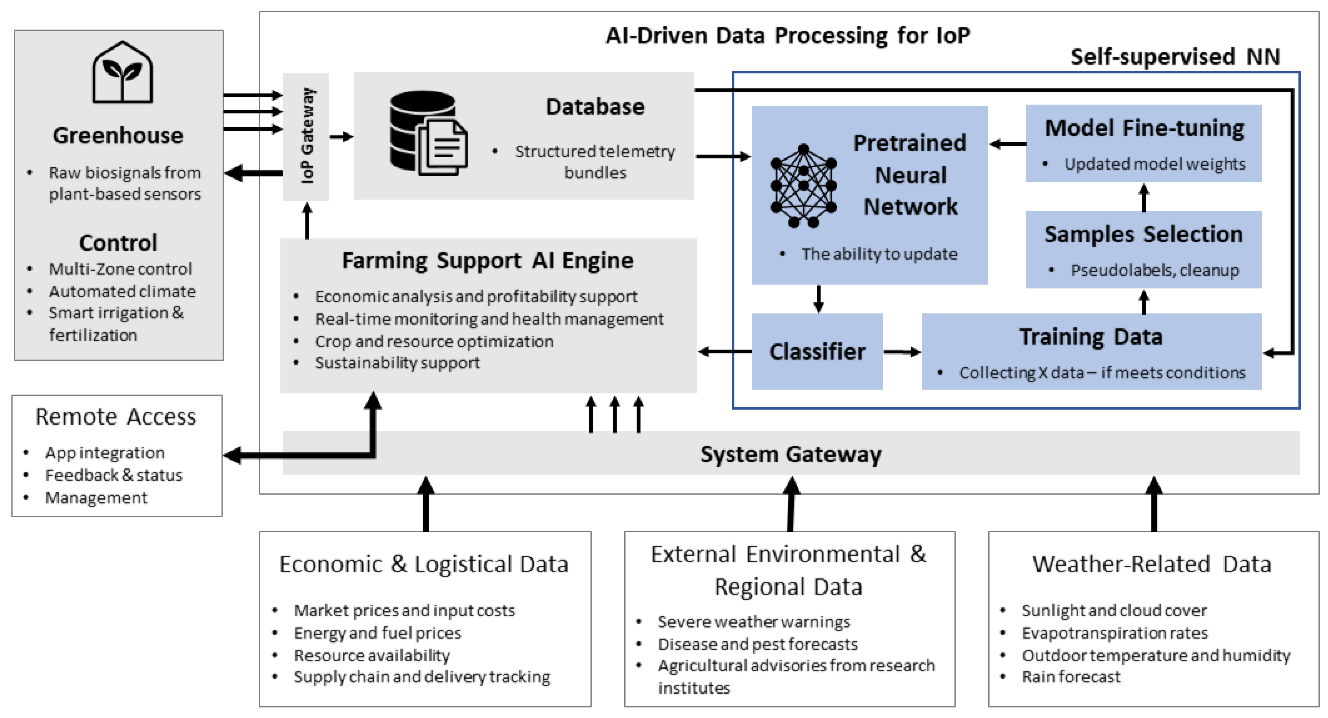 Finally, the data provided by the system gateway encompasses not only biosignal information but also contextual data related to economic, logistic, environmental, and regional factors. This comprehensive dataset ensures a holistic understanding of the greenhouse operation and its broader impact.