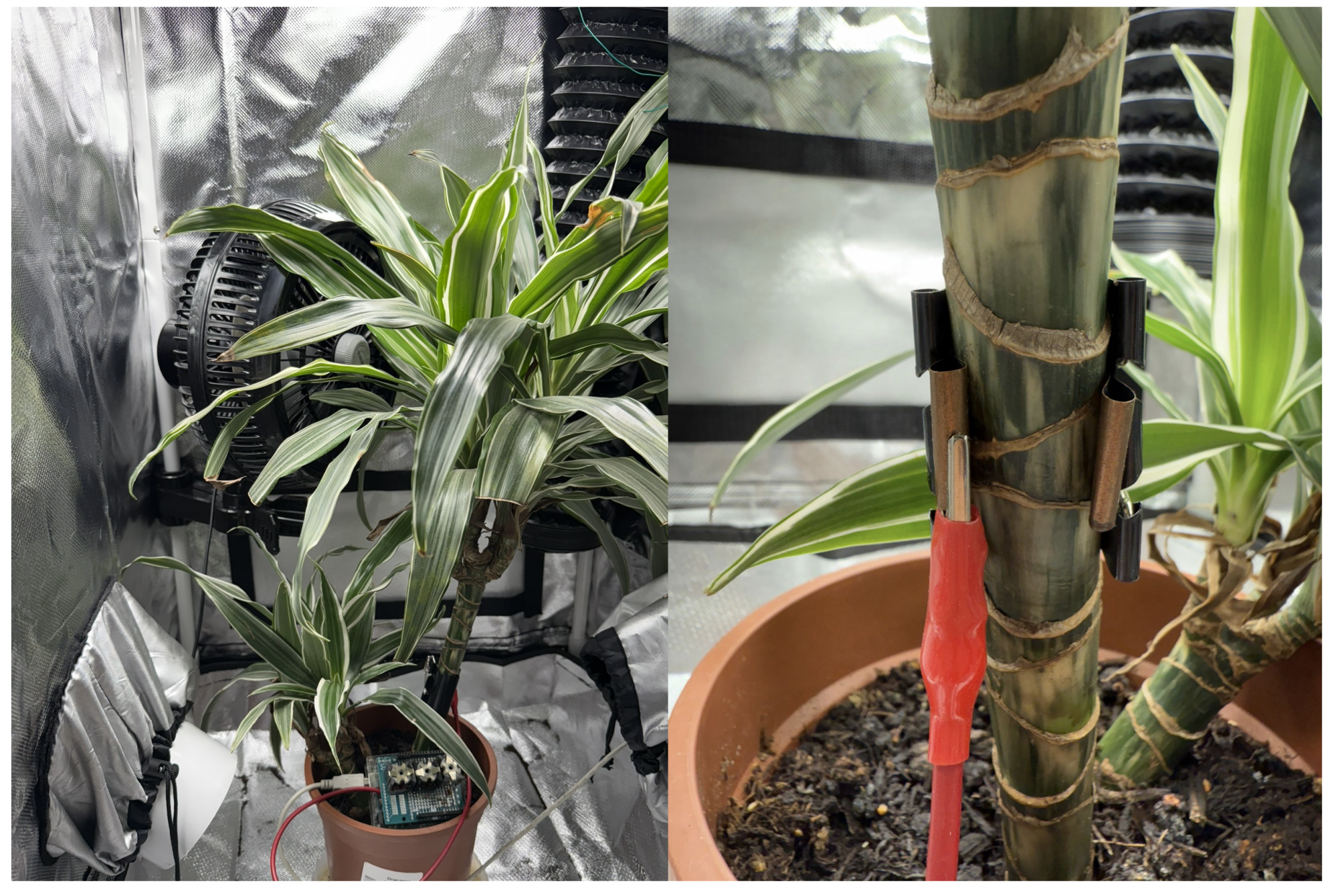 Dracaena deremensis (woody stem). This selection was designed to validate the versatility of the non-invasive strap interface across different plant structures. The primary focus of this work is to confirm the hardware’s signal acquisition sensitivity and the machine learning pipeline’s adaptability to different biological baselines. Plants from a local market were placed in a grow box, a special tent (50 × 50 × 140 cm) that controls environmental conditions such as humidity, temperature, and light (