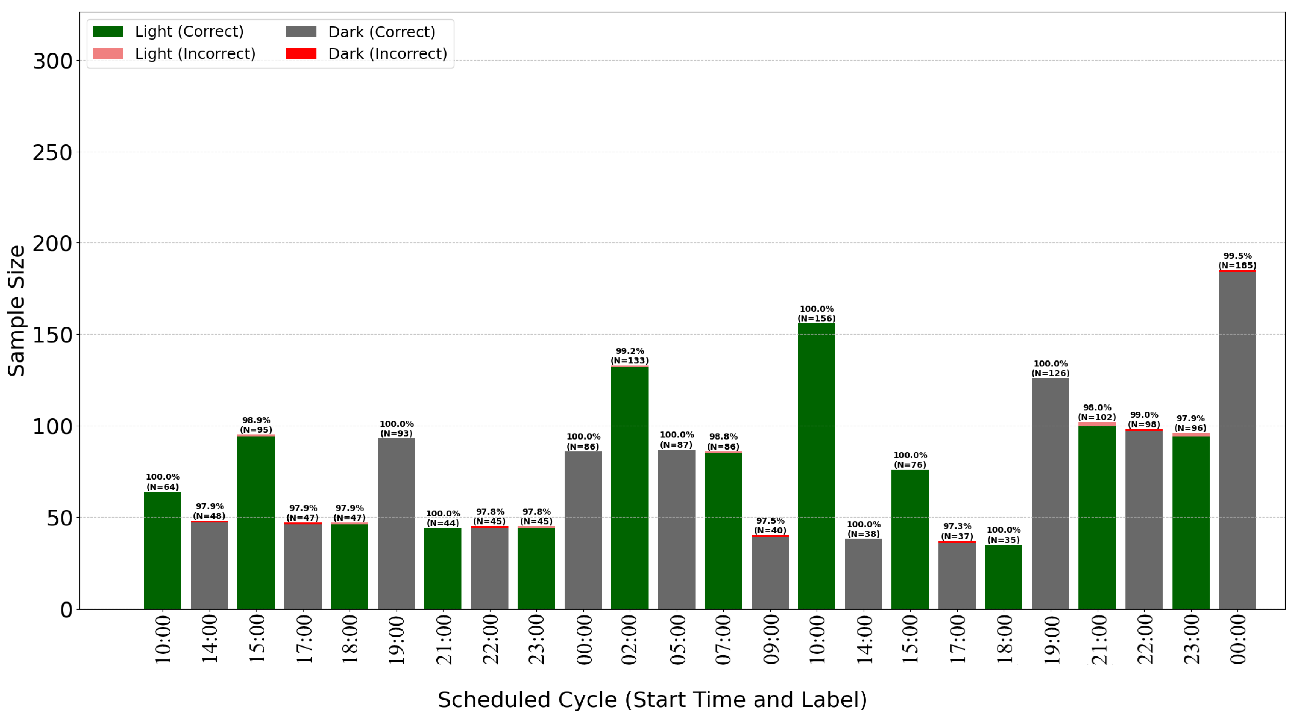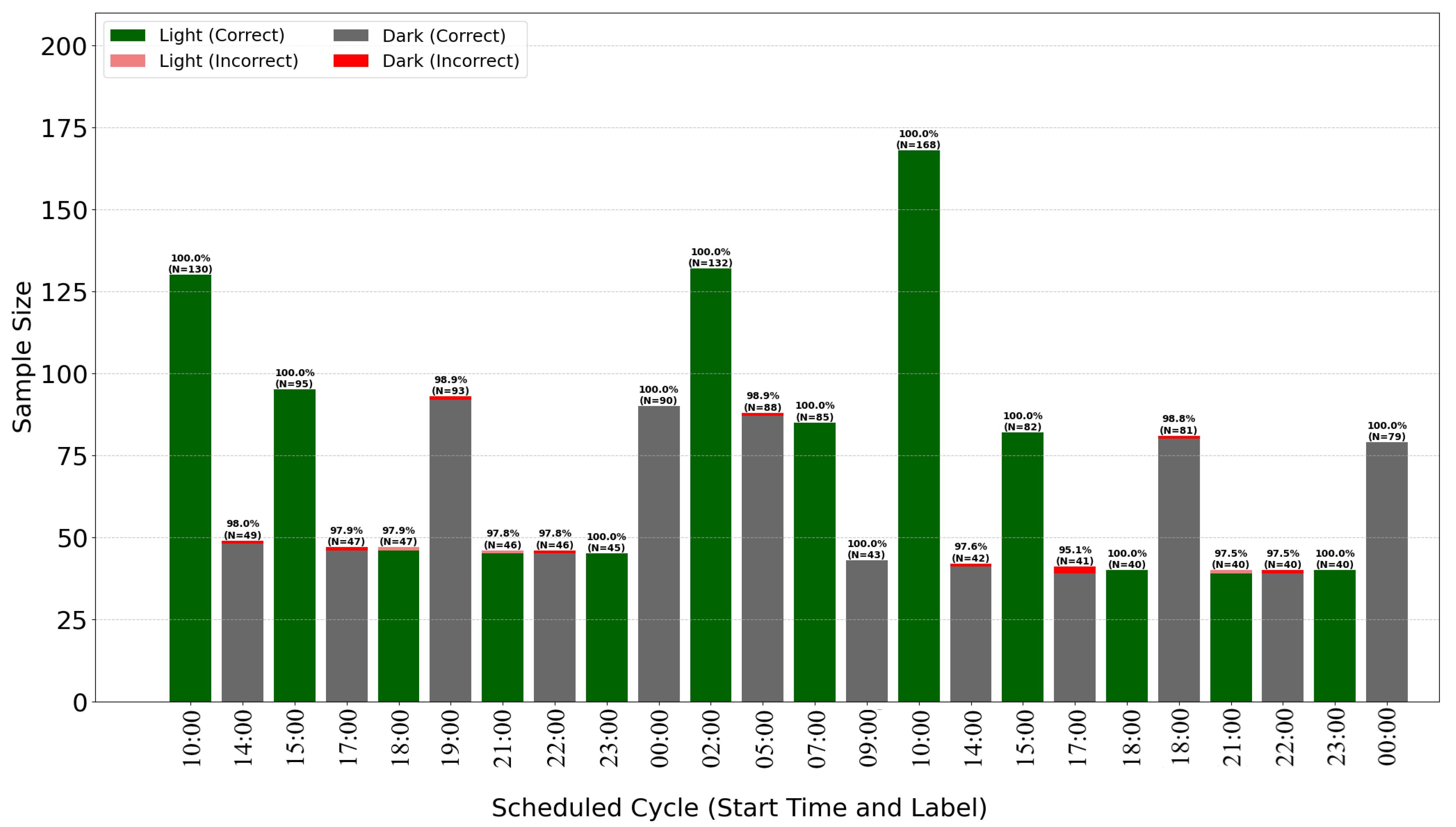 During the experiment, concerns were raised that the model might have learned to associate light exposure with fixed time intervals, rather than detecting real physiological responses. To address this issue, an additional experiment was conducted in which the light exposure pattern was deliberately altered after training. The model, connected directly to the sensor stream, was then evaluated under conditions where lights were turned on during expected dark periods.