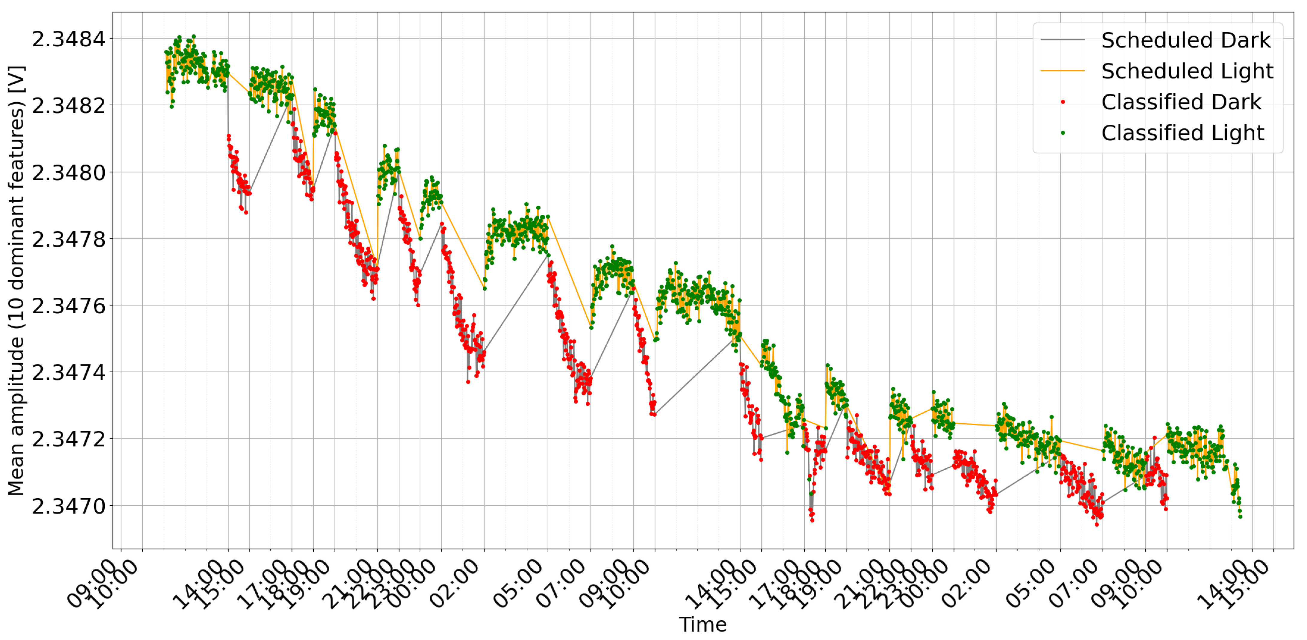 The experiment was conducted to check whether detecting when a plant is illuminated and for how long using a simple system is possible. Conducted under controlled conditions in a grow box with stable temperature and humidity, the test involved periodic light exposure using an artificial sunlight-mimicking lamp. Data collection covered both dark and light-exposed phases, enabling the system to learn recognition of these states and their temporal patterns through specialized machine learning algorithms. Through multiple iterations with varying exposure durations and algorithm parameter adjustments, we evaluated the system’s light-state classification accuracy.